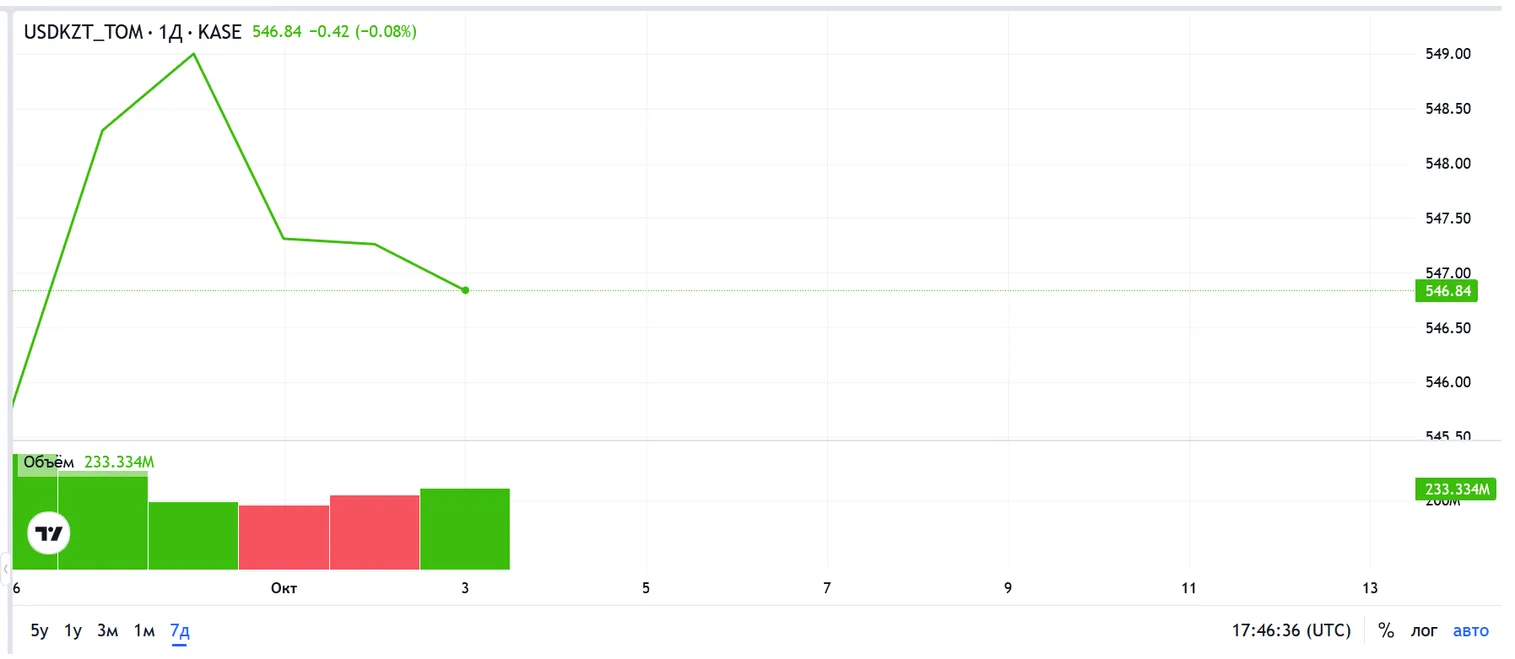 За торговую неделю нацвалюта укрепилась на 1,22 тенге. В понедельник, 29 сентября, средневзвешенный курс на 15:30 сложился на уровне 548,79 тенге за доллар. В пятницу, 3 октября – 547,57 тенге за доллар.