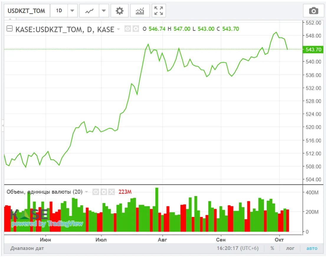 На текущий момент (10:20 ALA) курс по паре USD/KZT составляет 542,51 тенге за доллар.