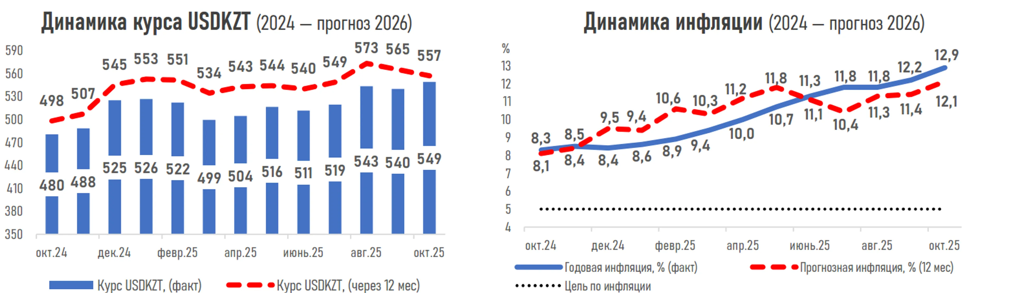 На валютном рынке в течение месяца ожидается некоторое ослабление тенге на фоне увеличения инвестиционной активности в экономике и внешних расчетов компаний вследствие ускорения освоения бюджетных средств и реализации крупных инвестиционных и инфраструктурных проектов. В совокупности эти факторы формируют повышенный спрос на инвалюту. К началу ноября курс по паре USD/KZT прогнозируется на уровне 544,1 тенге за доллар против 541,6 месяцем ранее. А через год - на отметке 556,8 тенге за доллар (+1,7% от текущего уровня).