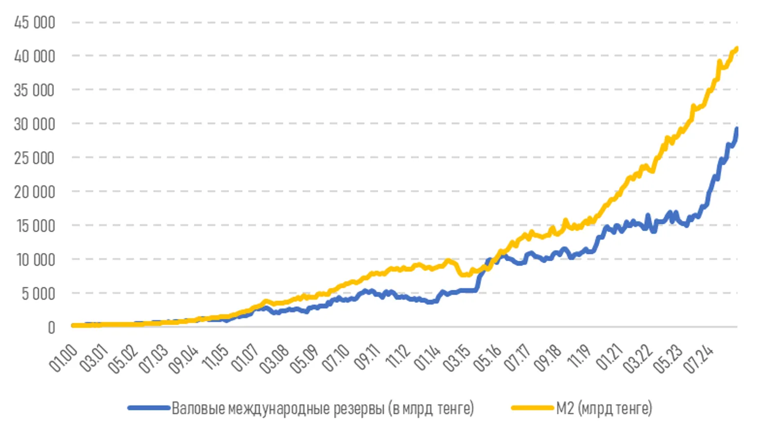 Из опубликованной статистики отметим, что валовые международные резервы Национального банка в сентябре выросли на 6,2% (+3,1 млрд долларов) – до 57,7 млрд долларов. Увеличение резервов связано с ростом портфеля золота на 14,5% – до 39,7 млрд долларов, в то время как средства банков второго уровня на счетах и депозитах в НБРК снизились до 18,0 млрд долларов (-8,4%). В совокупности международные резервы страны, включая активы Нацфонда в инвалюте (62,7 млрд долларов), на конец сентября составили 120,4 млрд долларов (+4,0 млрд долларов).