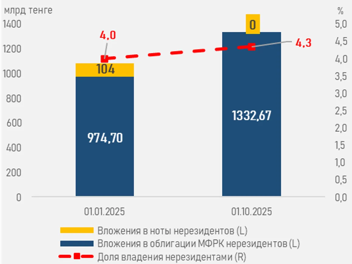 С учётом растущего интереса нерезидентов к тенговым активам, потенциал для дальнейшего укрепления тенге ещё не исчерпан. Отметим, что, по данным KASE, за 9М25 г. объём вложений нерезидентов в ГЦБ РК вырос до 1,3 трлн тенге, по сравнению с показателем в 1,1 трлн тенге на начало года (+24%).