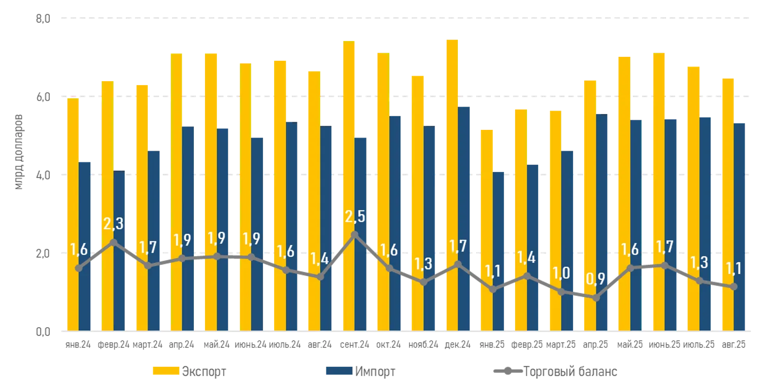 Среди опубликованной статистики отметим, что экспорт страны за восемь месяцев сократился до 50,2 млрд долларов (-5,7% г/г), тогда как импорт вырос до 40,1 млрд долларов (+2,8% г/г). Таким образом, профицит торгового баланса существенно снизился и составил 10,1 млрд долларов против 14,2 млрд долларов за аналогичный период 2024 года (-28,8%).