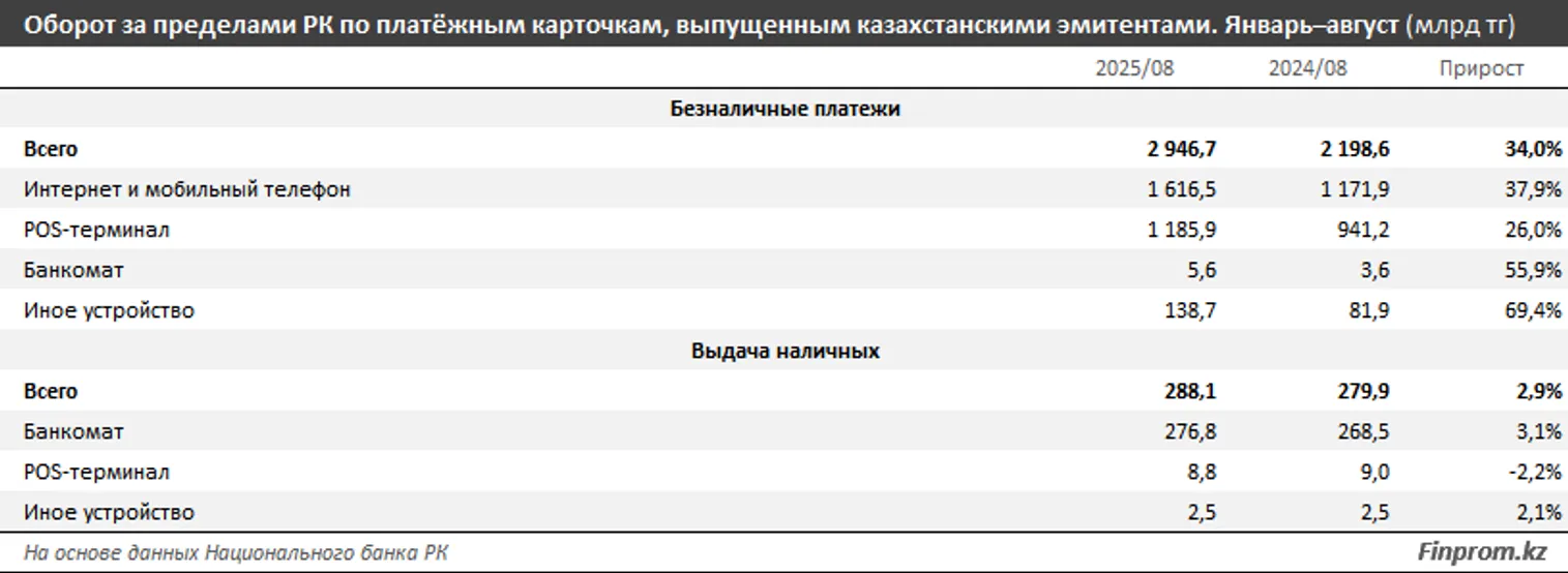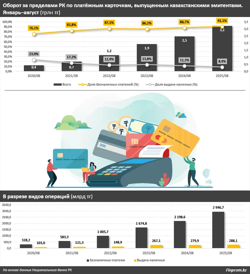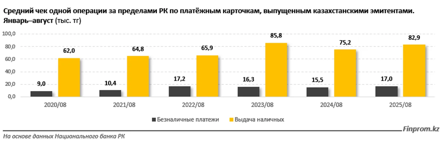 За январь–август 2025 года средний чек одной операции с использованием казахстанских платежных карточек за рубежом вырос как по безналичным платежам, так и по выдаче наличных. Так, средний чек одной безналичной операции за год увеличился с 15,5 тыс. до 17 тыс. тенге, а по выдаче наличных — с 75,2 тыс. до 82,9 тыс. тенге.