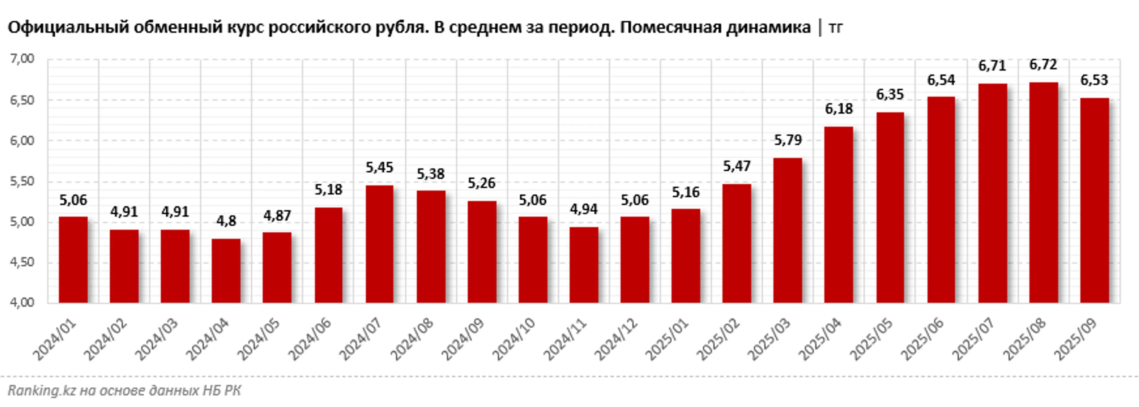 На фоне значительных отрицательных объемов чистых продаж обменными пунктами курс российского рубля в текущем году заметно вырос. В сентябре в среднем он составлял 6,53 тг — хоть и меньше по сравнению с августом на 2,8%, но больше, чем в январе, сразу на 26,6%. Для справки: по сравнению с сентябрём прошлого года курс рубля вырос на 24,1%.