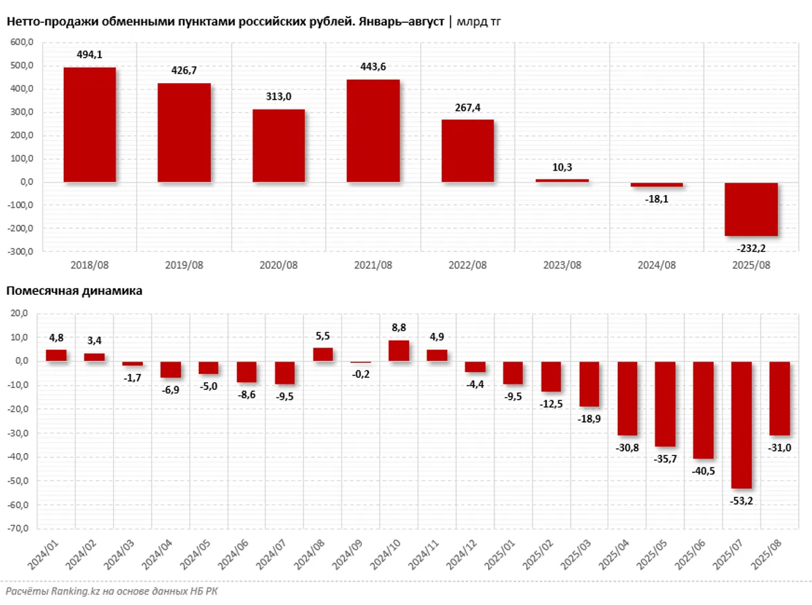 Российский рубль теряет позиции в Казахстане. Еще три года назад население РК активно скупало российскую валюту, однако к августу 2025 года ситуация полностью изменилась. Если за январь–август 2021 года нетто-продажи российских рублей казахстанскими обменными пунктами составляли 443,6 млрд тенге, а за аналогичный период 2022 года еще были внушительными — 267,4 млрд тенге, — то уже в следующем году их объем обвалился до 10,3 млрд тенге (хотя и это был все еще позитивный показатель). Далее объем и вовсе ушел в минусовую зону. Так, за восемь месяцев 2025 года покупка российских рублей казахстанскими обменными пунктами составила на 232,2 млрд тенге больше, чем продажа. Это рекордный отрицательный показатель за все время наблюдений. Для сравнения: еще год назад отрицательные нетто-продажи были незначительными по сравнению с текущими масштабами: минус 18 млрд тенге. Тенденция показывает устойчивое падение интереса к российской валюте, отмечают аналитики Ranking.kz.