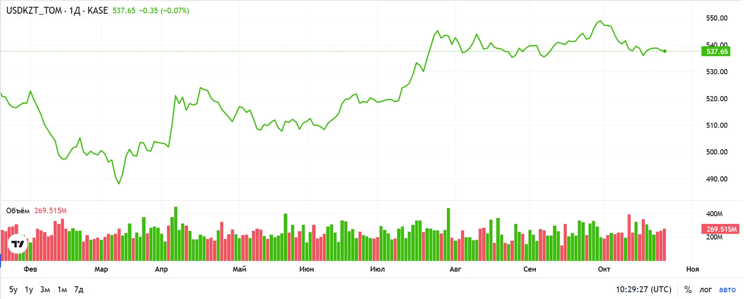 На текущий момент (10:26 ALA) курс по паре USD/KZT составляет 536,7 тенге за доллар.
