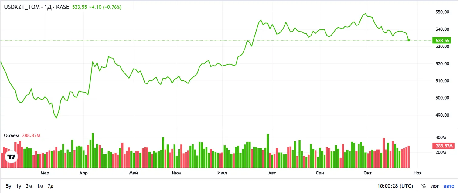 В начале недели нацвалюта продемонстрировала умеренное укрепление: по итогам биржевых торгов вторника курс по паре USD/KZT опустился до отметки 535,36 тенге за доллар (-2,77 тенге). При этом торговая активность сохранилась выше средних значений текущего года – совокупный объём торгов составил 288,9 млн долларов (+19,4 млн долларов). Увеличение предложения инвалюты на локальном рынке могло быть обусловлено её привлекательным уровнем продажи, необходимостью осуществления тенговых расчётов к концу месяца, фиксацией прибыли валютными трейдерами, а также притоком средств нерезидентов на фоне высоких ставок по тенговым инструментам.