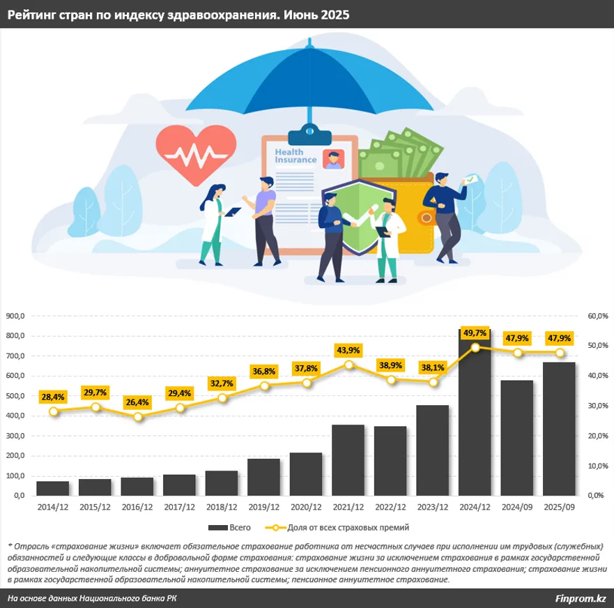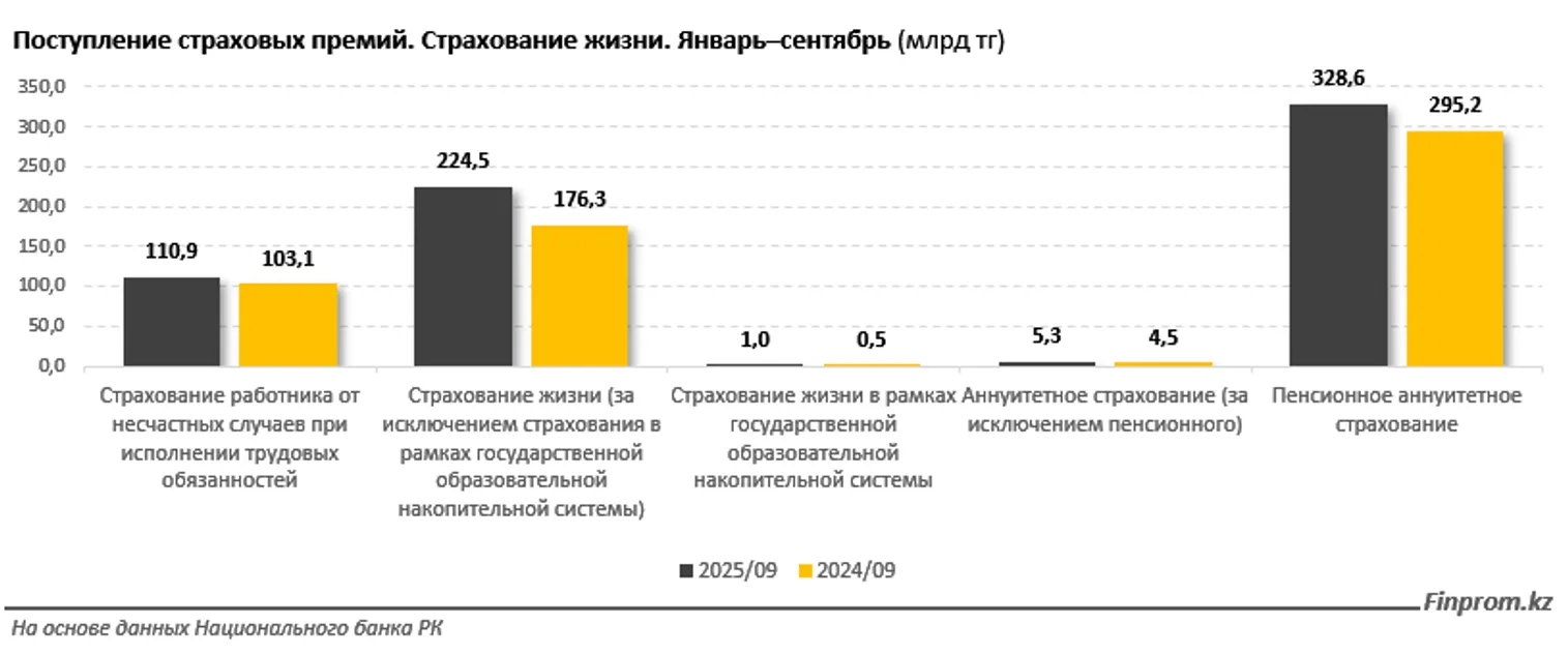 Объем поступлений страховых премий по страхованию жизни по итогам января–сентября 2025 года составил 670,2 млрд тенге — на 15,6% больше, чем за аналогичный период прошлого года.