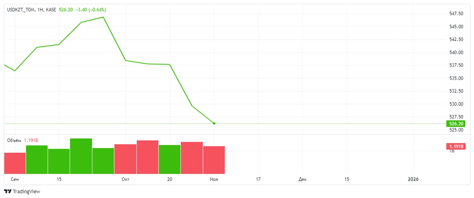 За торговую неделю нацвалюта укрепилась на 2,29 тенге. В понедельник, 3 ноября, средневзвешенный курс на 15:30 сложился на уровне 528,31 тенге за доллар. В пятницу, 7 ноября – 526,02 тенге за доллар.