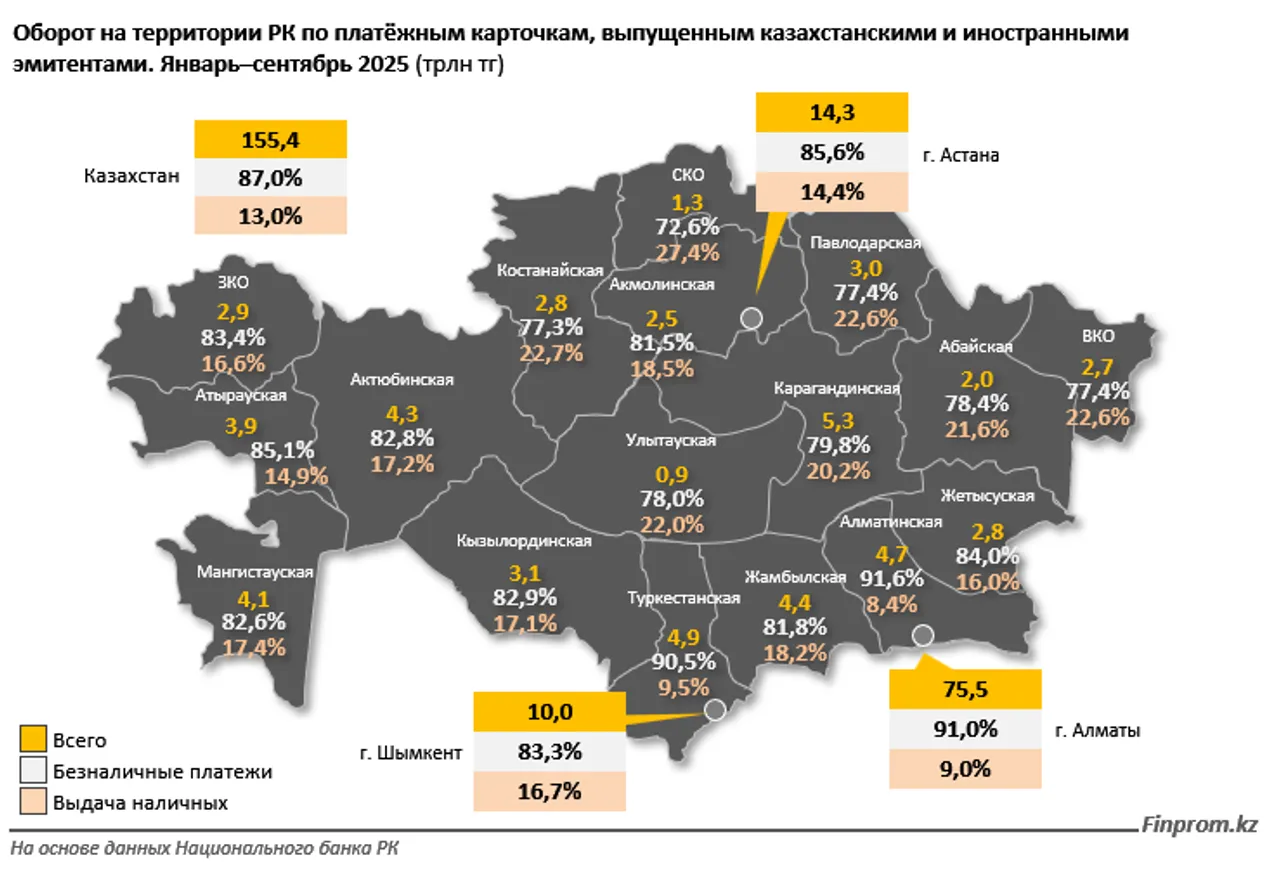 Значительные объёмы оборота по картам пришлись также на Астану и Шымкент: 14,3 трлн и 10 трлн тенге соответственно. Уровень проникновения безналичных платежей составил 85,6% в Астане и 83,3% в Шымкенте.
