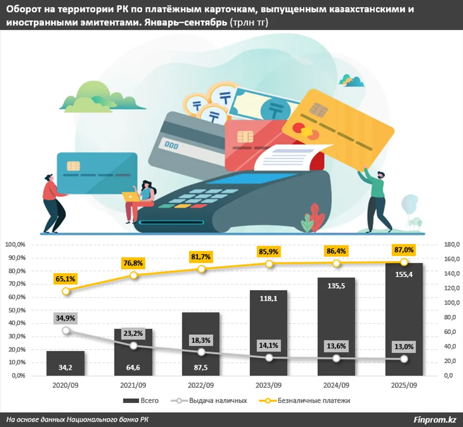 За январь–сентябрь 2025 года оборот на территории Казахстана по платёжным карточкам, выпущенным казахстанскими и иностранными эмитентами, достиг 155,4 трлн тенге — на 14,7% больше, чем за аналогичный период 2024-го. Из них на безналичные платежи пришлось 135,2 трлн тенге (плюс 15,5% за год), на выдачу наличных — 20,1 трлн тенге (плюс 9,1%). Удельный вес безналичных платежей в РК продолжает расти: за последний год он увеличился с 86,4% за январь–сентябрь 2024-го до 87% за аналогичный период текущего года, пишет finprom.kz.