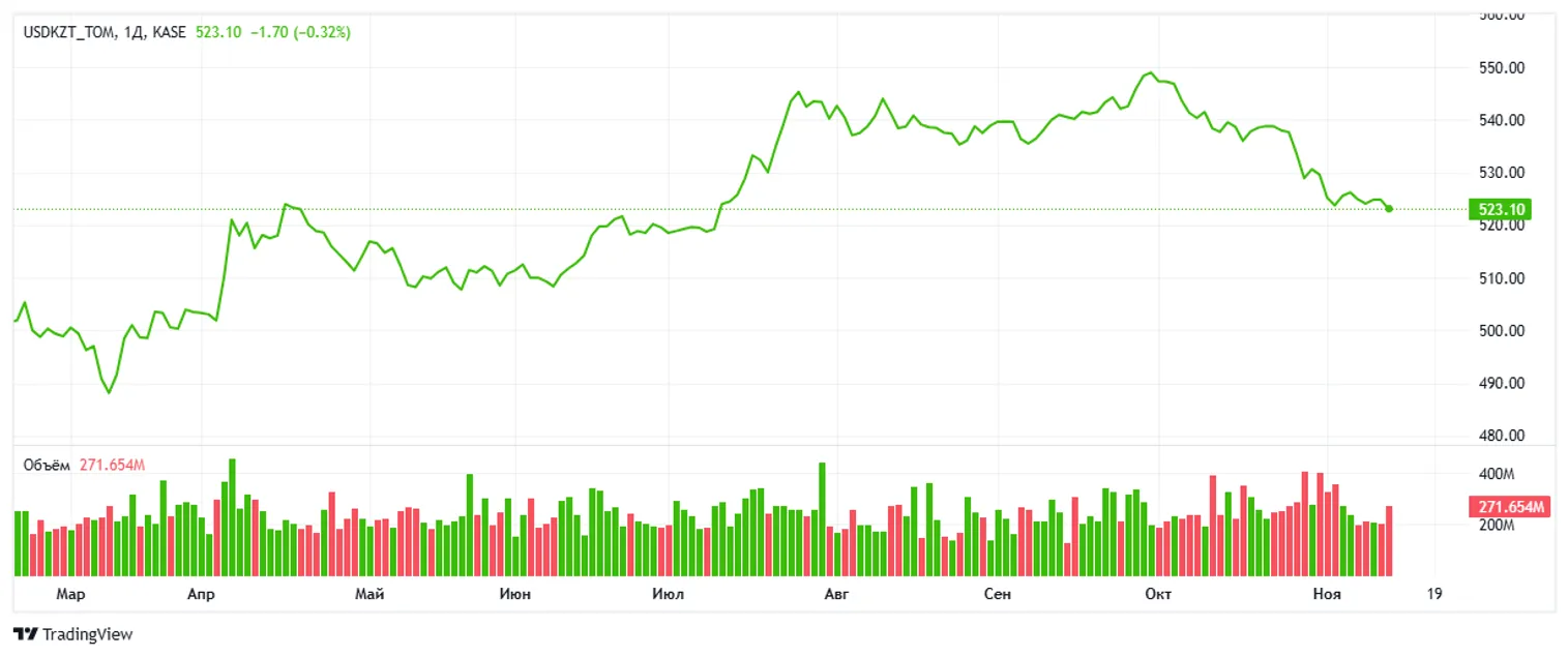 По итогам валютных торгов четверга пара USD/KZT показала слабую волатильность, закрывшись на уровне 524,58 тенге (-0,68 тенге). При этом торговая активность остается у своих среднегодовых значений: совокупный объем составил 202,2 млн долларов (-1,4 млн долларов). На вчерашних торгах внешний фон складывался положительно для нацвалюты: нефтяные котировки восстанавливались, индекс доллара США снижался. Относительный баланс на локальном рынке также мог быть связан с тем, что объемы предложения инвалюты, включая ее продажу в рамках нормы об обязательной продаже валютной выручки субъектами КГС, экспортерами и в рамках операций НБРК, полностью покрывали спрос на нее со стороны казахстанских экспортеров и компаний – внешних заемщиков.