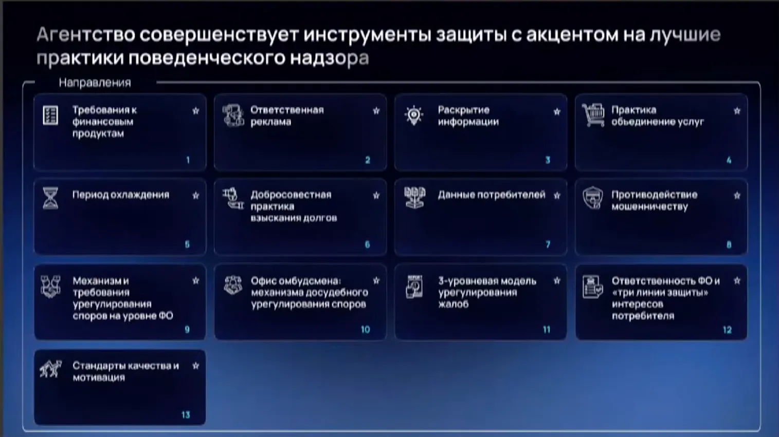«Одним из ключевых ориентиров при написании того, как мы видим поведенческий надзор в Казахстане, были стандарты G20 ОЭСР – 12 принципов, – сообщает он. – Сейчас отличное время установить четкие стандарты для рынка, сделать какие-то нормативные документы, которые мы сейчас совместно с банками разрабатываем. Часть элементов поведенческого надзора уже имеется у нас в Казахстане – раньше мы называли это защитой прав потребителей финансовых услуг. Например, предельная ставка по ГЭСВ или что нельзя писать маленьким шрифтом в контрактах».