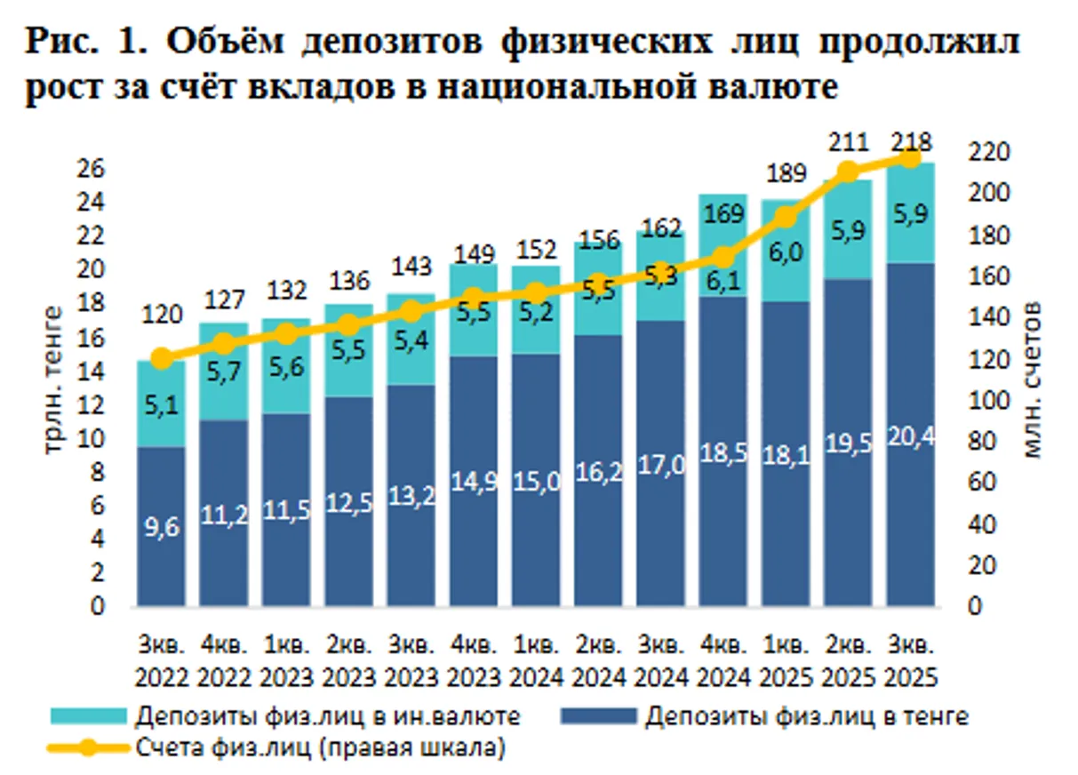 «Можно ожидать менее активного пересмотра банками ставок вознаграждения, так как текущая доходность уже находится на достаточно высоком уровне, а также с учетом повышения минимальных резервных требований по обязательствам банка, в том числе по депозитам. Таким образом, третий квартал завершился для розничного депозитного рынка положительно. Объём депозитов физических лиц увеличился более чем на триллион тенге, при этом долларизация депозитов достигла исторического минимума. Вкладчики диверсифицируют свои депозитные портфели и все больше интересуются сберегательными и срочными вкладами, в результате чего доля стабильного фондирования стала составлять пятую часть от объёма депозитов физических лиц», - отметили в фонде.