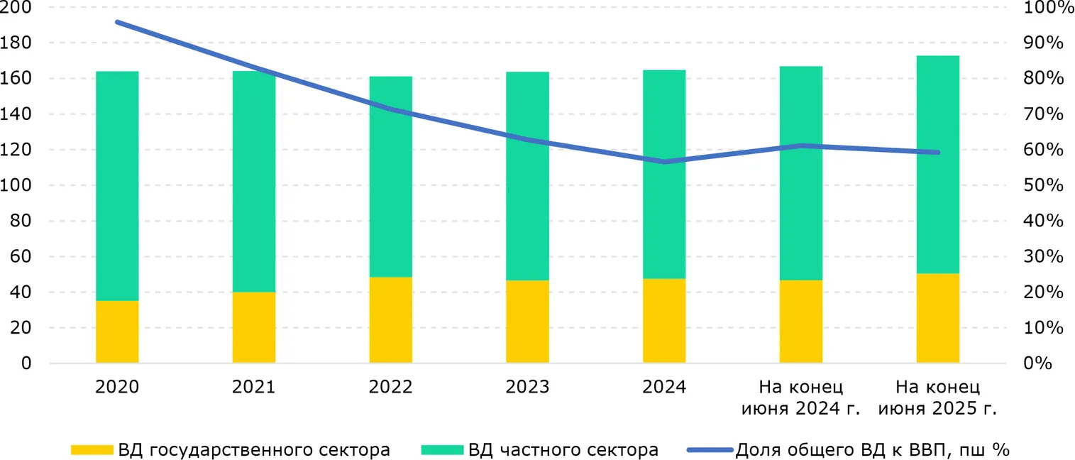 На конец июня 2025 года внешний долг (ВД) Казахстана составил 172,8 млрд долларов, увеличившись на 3,6% г/г. За данный период отношение внешнего долга к ВВП составило 59,2%, увеличившись с 56,6% в 2024 году. Это связано с опережающим ростом внешнего долга по сравнению с динамикой ВВП. У стран с сопоставимой экономикой, таких как Россия и Узбекистан, в 2024 году отношение внешнего долга к ВВП составляло 13,4% и 55,7% соответственно, у развитых стран, таких как США – 124,3%.