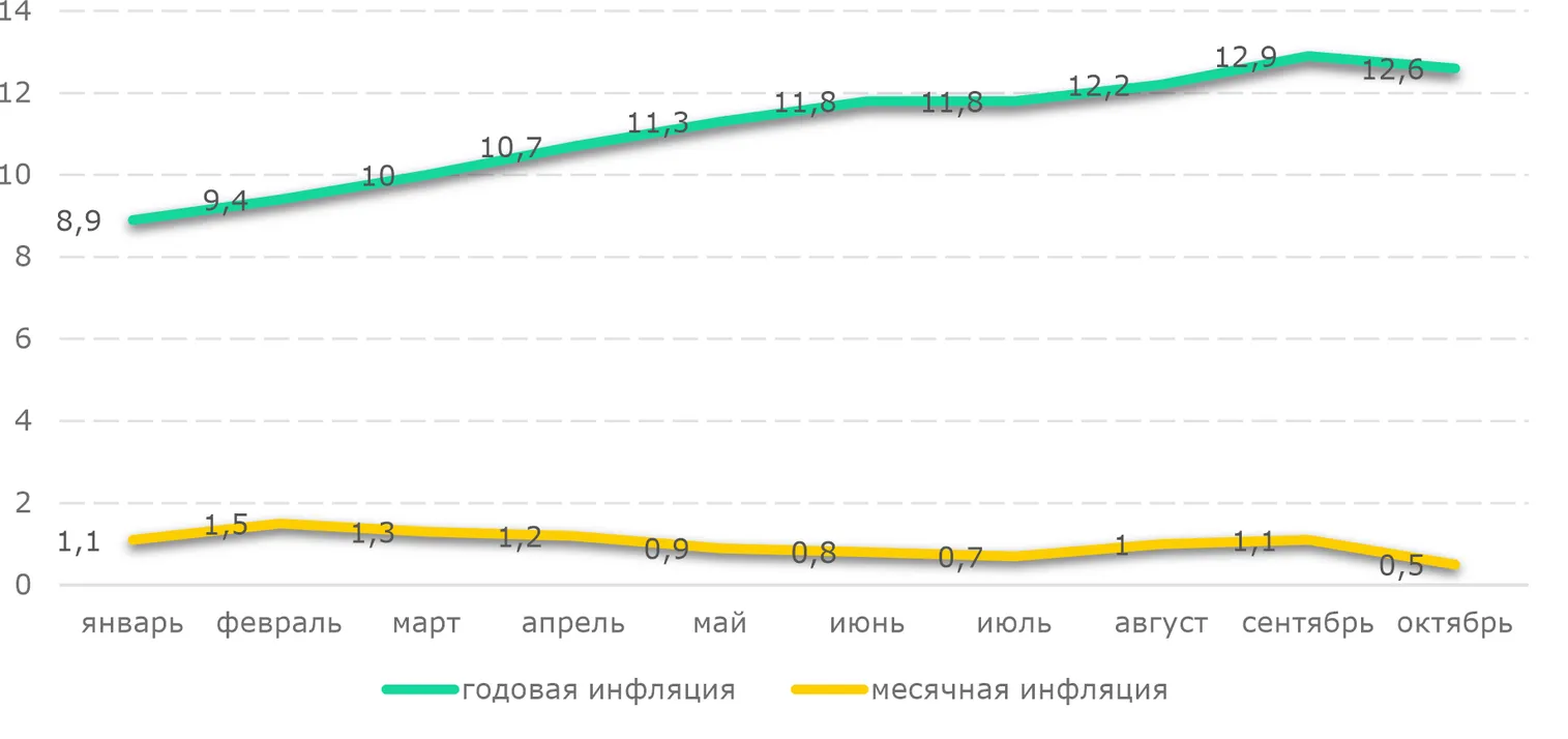 В октябре 2025 года потребительская инфляция в годовом выражении составила 12,6% — против 12,9% месяцем ранее (Рис. 1). Снижение темпов роста цен стало первым в нынешнем году. Главным драйвером выступило замедление роста стоимости услуг (на 0,4 п.п. г/г), в то время как инфляция продовольственных и непродовольственных товаров, напротив, ускорилась на 0,8 и 0,2 п.п. г/г соответственно.