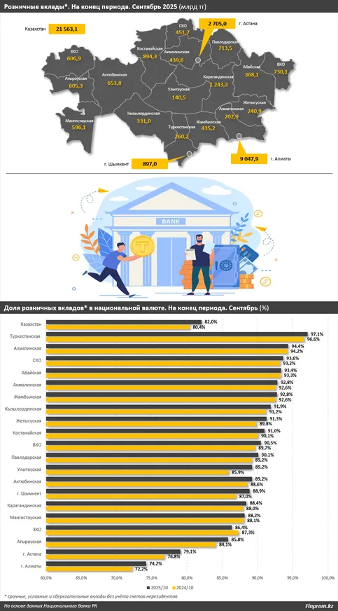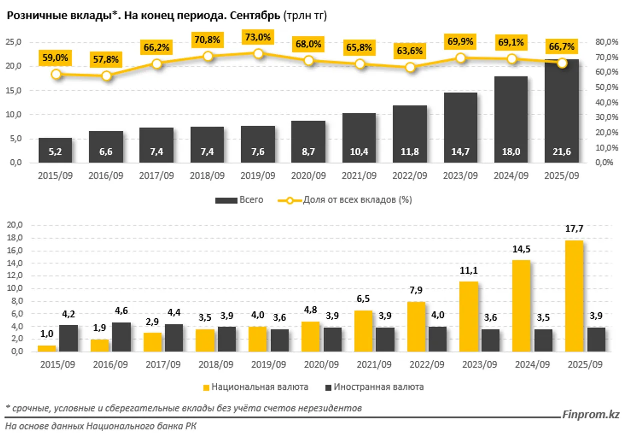 Объем розничных вкладов* на сентябрь 2025 года достиг 21,6 трлн тенге — на 19,9% больше, чем годом ранее. Доля розничных депозитов с 2020-го варьируется в пределах 63,6–69,9% от всего объема вкладов, на сентябрь текущего года она составила 66,7%, сообщает Finprom.kz.