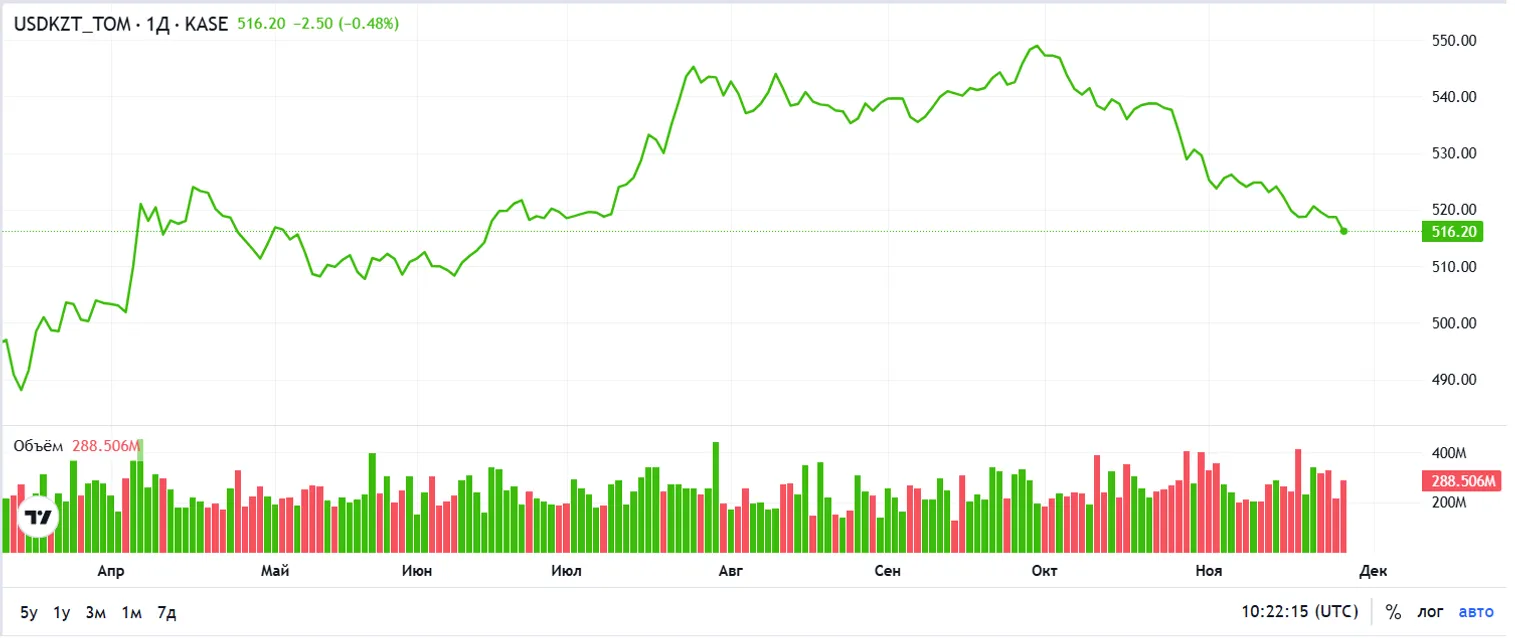 На торговой сессии четверга продавцы иностранной валюты имели перевес над её покупателями. По итогам дня средневзвешенный курс по паре USD/KZT снизился до отметки 516,78 тенге за доллар (-1,83 тенге) при повышенном объёме торгов – 288,5 млн долларов (+75,2 млн долларов). Такая динамика на локальном рынке могла происходить под влиянием ряда факторов, включая высокие процентные ставки в экономике, склонность к риску со стороны глобальных инвесторов, операции НБРК, субъектов КГС и экспортёров.