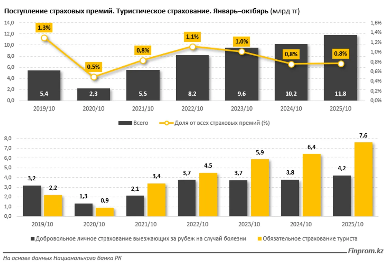 Объём рынка туристического страхования в Казахстане также показывает рост. Поступление страховых премий по туристическому страхованию за год увеличилось на 15,6%, достигнув 11,8 млрд тенге за январь–октябрь 2025-го. Годом ранее был отмечен рост на 6,6%.