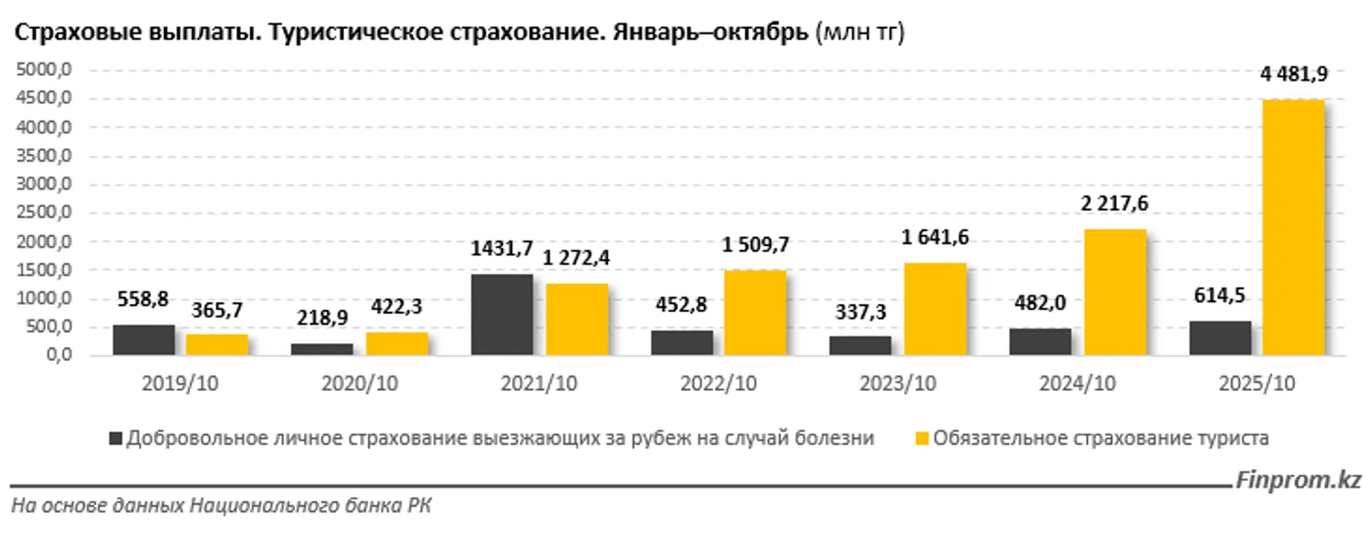 Объём выплат по туристическому страхованию за год вырос на 88,8%: с 2,7 млрд тенге за январь–октябрь прошлого года до 5,1 млрд тенге за аналогичный период 2025-го. При этом сразу 4,5 млрд тенге составили страховые выплаты по обязательному страхованию туристов, увеличившиеся за год в два раза. На добровольное личное страхование выезжающих за рубеж на случай болезни пришлось 614,5 млн тенге — на 27,5% больше, чем годом ранее.