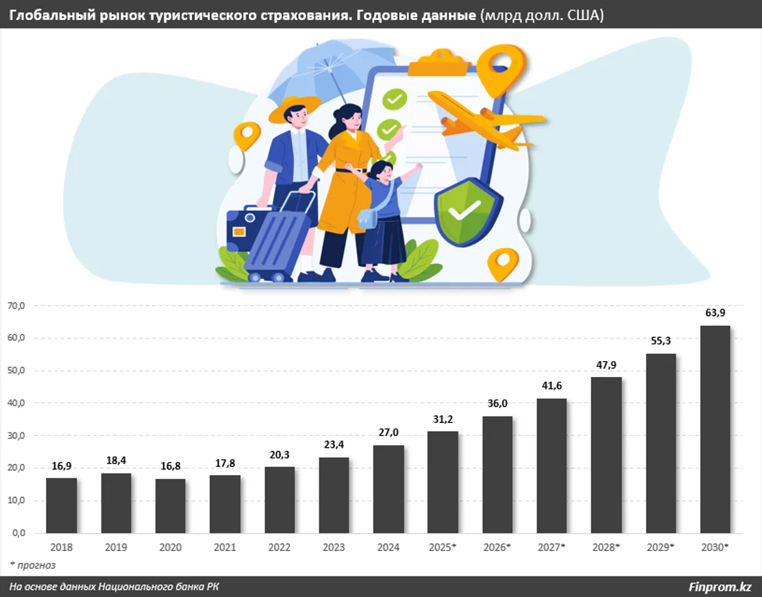Глобальный рынок туристического страхования в 2024 году составил 27 млрд долларов — на 15,8% больше, чем в 2023-м. По прогнозам Grand View Research, в 2025 году он достигнет 31,2 млрд долларов, а к 2030-му увеличится до 63,9 млрд долларов. Среднегодовой темп роста с 2025 по 2030 год будет держаться на уровне 15,4%, пишет finprom.kz.