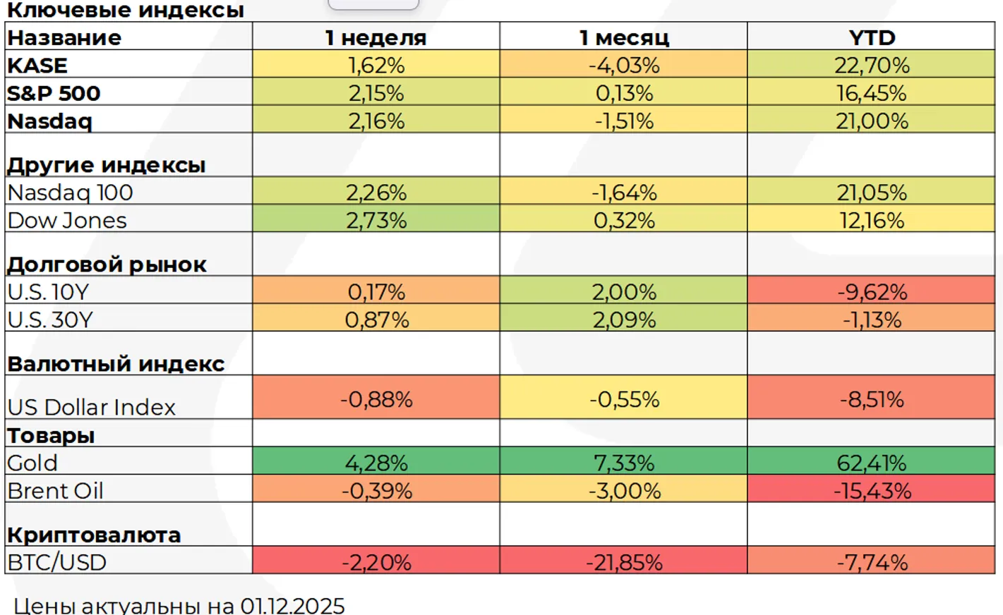 Обзор рынков за 24-28 ноября 2025 года подготовил аналитик Департамента аналитики и исследований BCC Invest Алдияр Ануарбеков.