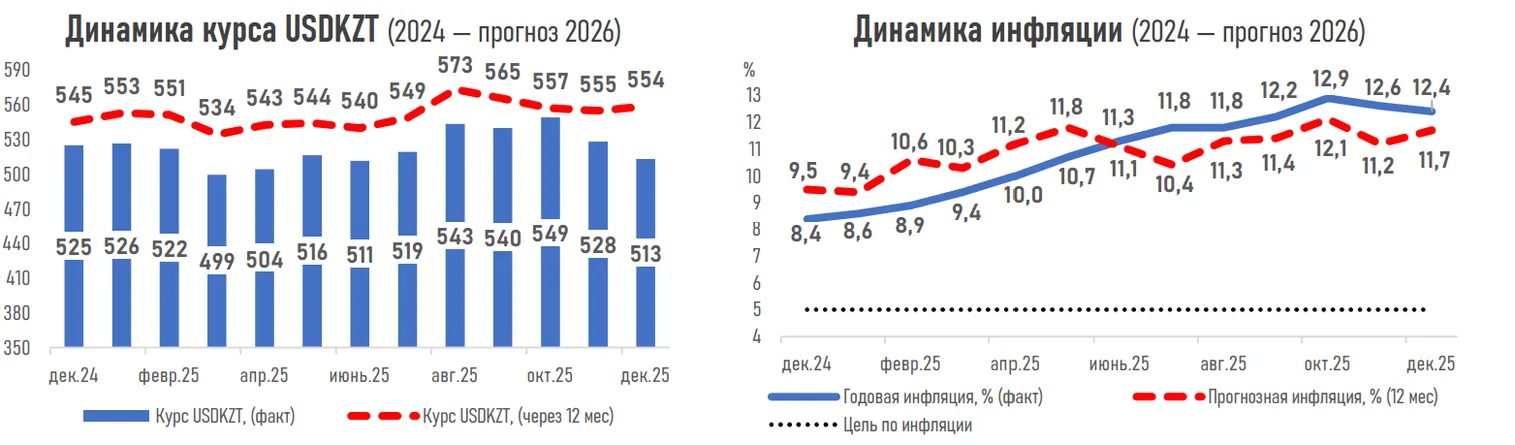 - Однако на 12-месячном горизонте рост доллара к нацвалюте может составить 9% (тек. 508,1) — до 553,6 тенге за доллар. Ключевыми факторами такого движения могут выступить падение доходов от экспорта сырья, ожидаемый рост импорта на фоне реализации инвестиционных и инфраструктурных проектов, планируемое почти двукратное сокращение трансфертов из Нацфонда в следующем году (до 2,8 трлн против 5,3 трлн тенге в 2025 году).