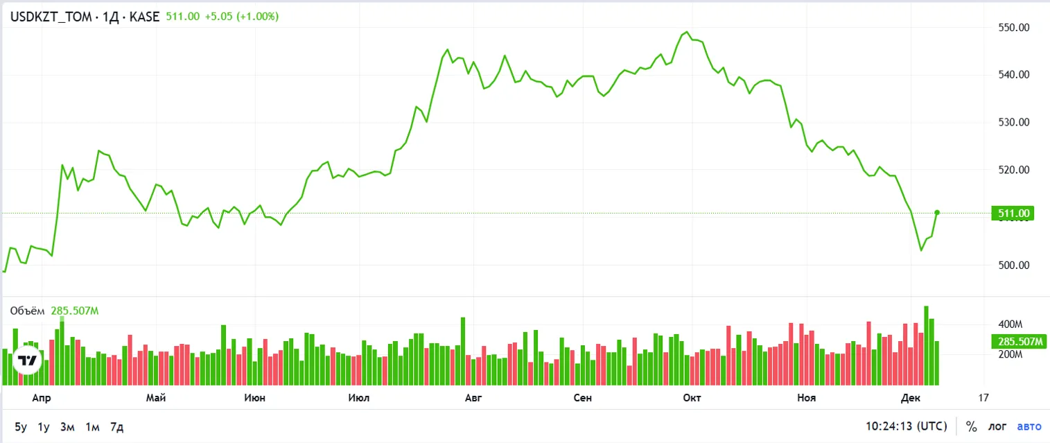 Курс по паре USD/KZT начал неделю с роста, зафиксировавшись на уровне 509,21 тенге за доллар (+4,60 тенге) при объеме торгов 285,5 млн долларов (-151,4 млн долларов). Определенное давление на курс тенге могли оказывать как внешние, так и внутренние факторы. Среди внешних можно выделить снижение нефтяных котировок, рост индекса доллара США и ослабление рубля во время валютных торгов. В то же время некоторый дисбаланс на локальном рынке может быть связан с привлекательным курсом приобретения иностранной валюты и повышенным спросом на нее со стороны отдельных участников перед завершением года.