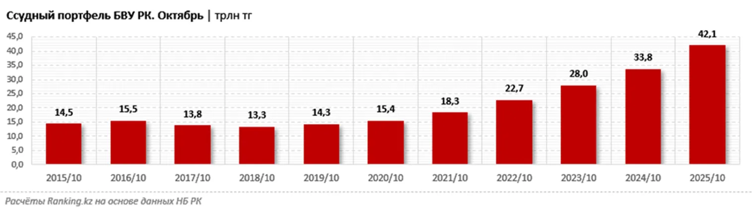Для справки: за год совокупный ссудный портфель БВУ РК увеличился на 24,6%, за пять лет — в 1,7 раза, а за десятилетие — в 2,9 раза.