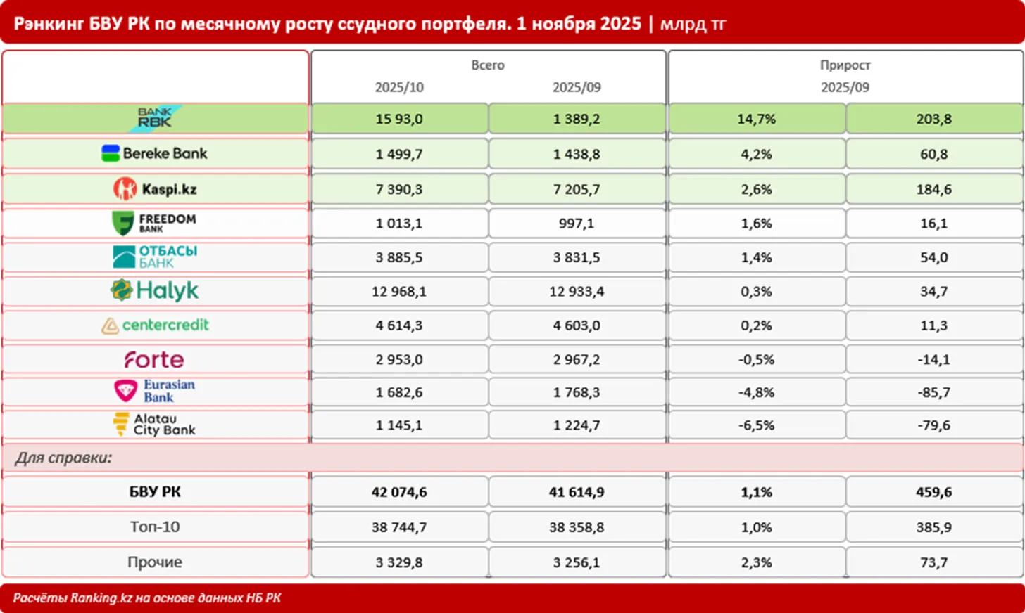 Абсолютный лидер по месячному росту — Bank RBK, увеличивший портфель займов сразу на 14,7%, до 1,59 трлн тенге. В стоимостном выражении рост составил 203,8 млрд тенге, это рекорд по всему сектору. С начала года рост ссудного портфеля в банке достиг уже 41,7%, при общем росте в среднем по сектору лишь на 17,4%.