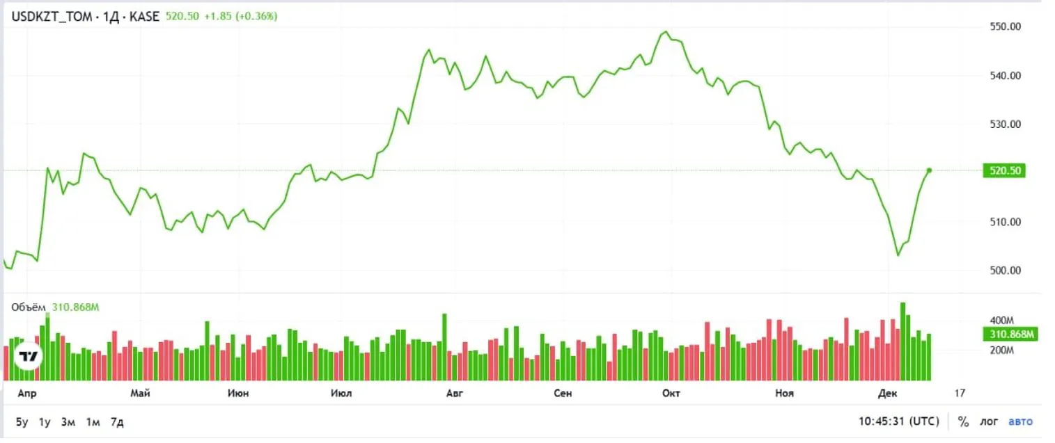 Доллар на KASE растет уже пятую сессию подряд. По итогам валютных торгов четверга курс по паре USD/KZT поднялся до 520,22 тенге за доллар (+1,94 тенге) при повышенных объемах торгов в 310,9 млн долларов (+48,7 млн долларов). Внешний фон складывается довольно нейтрально: котировки нефти вместе с индексом доллара показали снижение во время торгов. Вероятно, такая динамика объясняется совокупностью внутренних факторов, включая привлекательный курс приобретения инвалюты и разовый предновогодний спрос со стороны отдельных игроков валютного рынка.