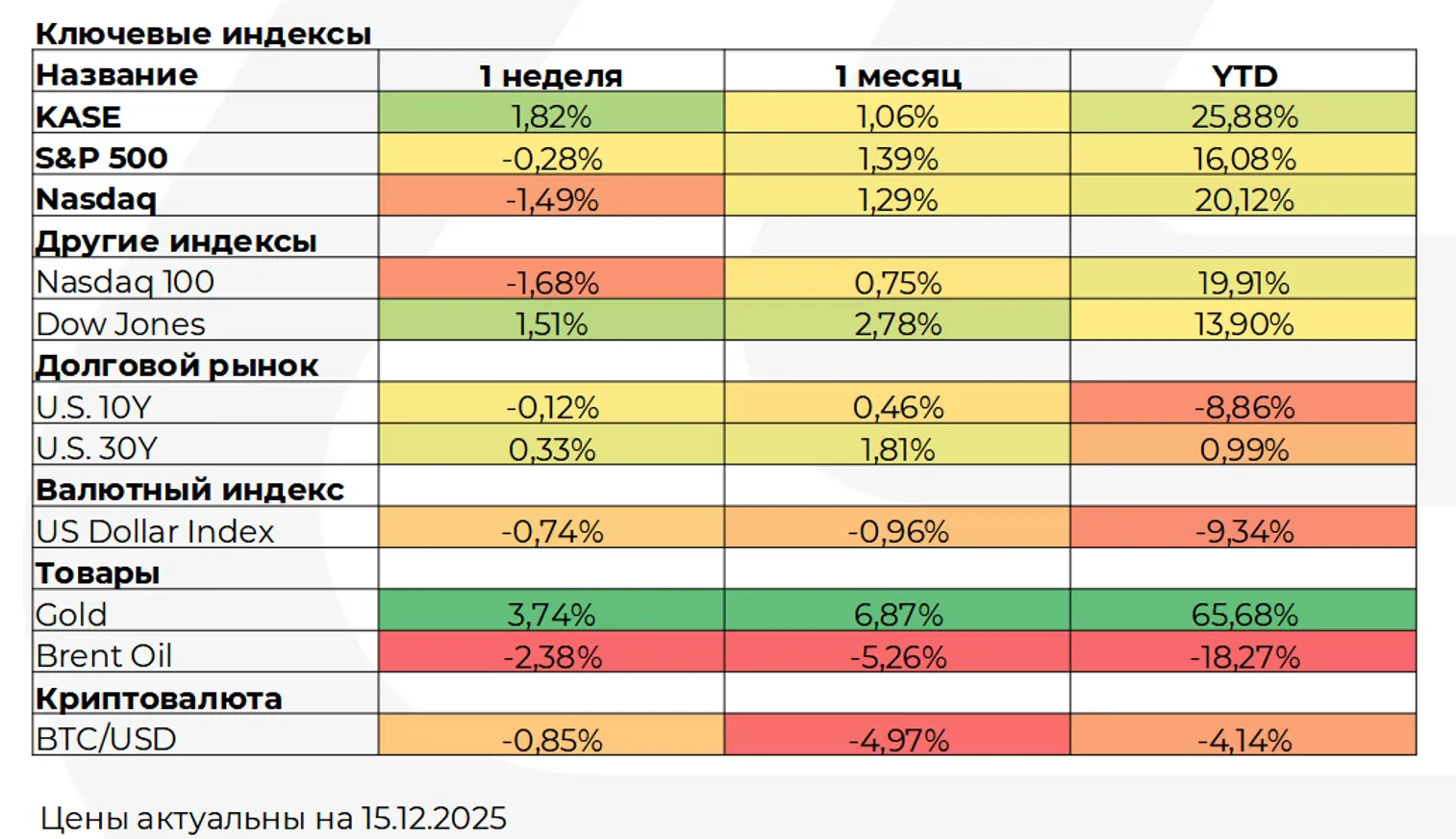 Обзор рынков за 8-12 декабря 2025 года подготовил аналитик Департамента аналитики и исследований BCC Invest Алдияр Ануарбеков.