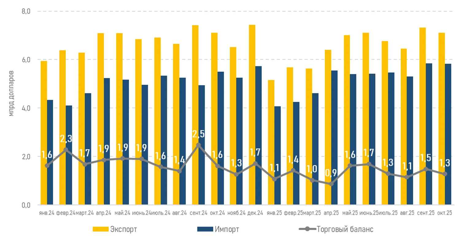 Из опубликованной статистики отметим, что экспорт страны за десять месяцев сократился до 64,6 млрд долларов (-4,6% г/г), тогда как импорт вырос до 51,7 млрд долларов (+4,7% г/г). Таким образом, профицит торгового баланса значительно снизился и составил 12,9 млрд долларов против 18,3 млрд долларов за аналогичный период 2024 года (-29,6%).