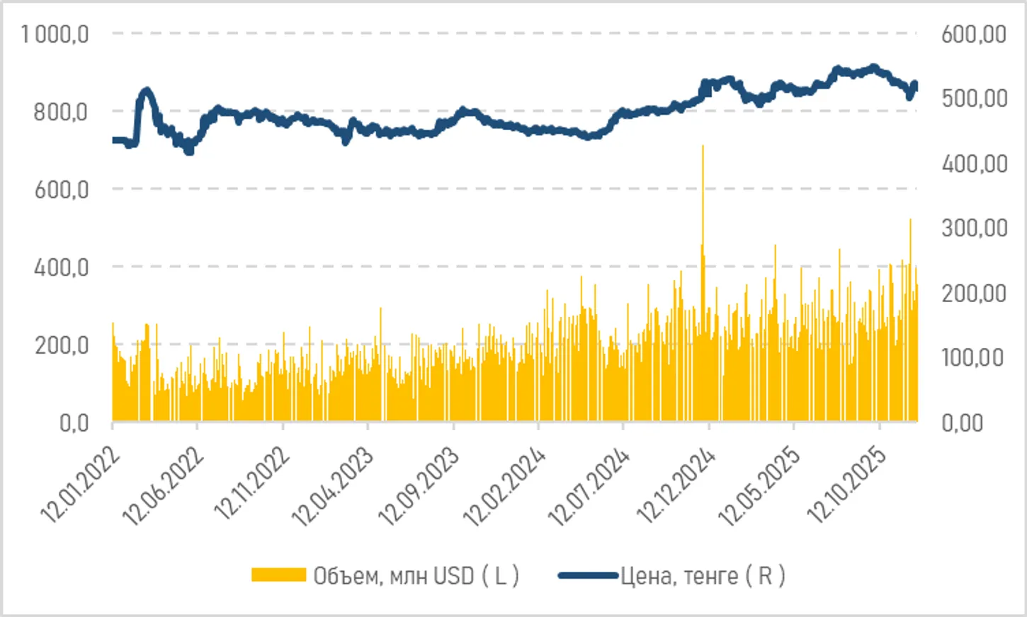 На валютных торгах четверга отмечался относительный баланс между спросом и предложением инвалюты. По итогам торгов курс по паре USD/KZT сложился на уровне 514,12 тенге за доллар (-0,20 тенге) при повышенном объеме в 354,2 млн долларов (+7,8 млн долларов). Учитывая нейтральный внешний фон (рост нефтяных котировок и доллара США), подобная динамика, вероятно, в большей степени объясняется внутренними факторами. С одной стороны, продажи инвалюты со стороны Национального банка, экспортеров и субъектов КГС дают существенную поддержку нацвалюте, в то время как высокая базовая ставка повышает привлекательность тенговых активов. С другой стороны, предновогодний спрос на импорт и инвалюту со стороны населения, а также выплаты по внешнему долгу ограничивают укрепление тенге.