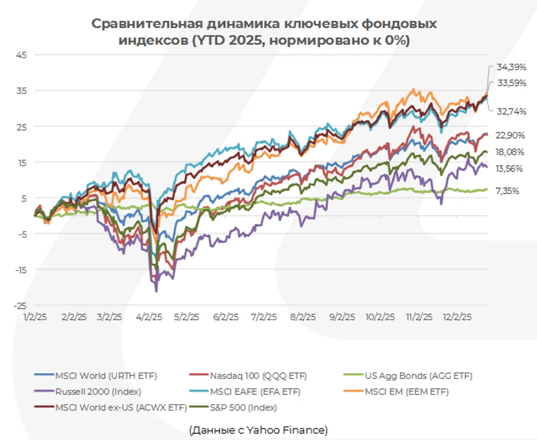 Одна из главных особенностей 2025 года - лидерство зарубежных рынков. По совокупной доходности с начала года S&P 500 выглядел сильным, но уступал двум крупным международным ориентирам: индексу развитых рынков без США и индексу развивающихся рынков. Это подчёркивает, что в 2025 году инвесторы получали премию за географическую диверсификацию. Региональные истории были разными. В Европе настроения поддерживались ожиданиями восстановления в 2026 году, но деловые опросы оставались сдержанными и неоднородными. В Японии рост акций сочетался с ожиданиями дальнейшего ужесточения денежной политики и укреплением иены. В Китае рынки росли на ожиданиях достижения целевого роста, хотя макроиндикаторы указывали на слабость внутреннего спроса и влияние проблем в недвижимости. В 2025 году работала именно диверсификация по регионам, а не ставка на один «лучший рынок».