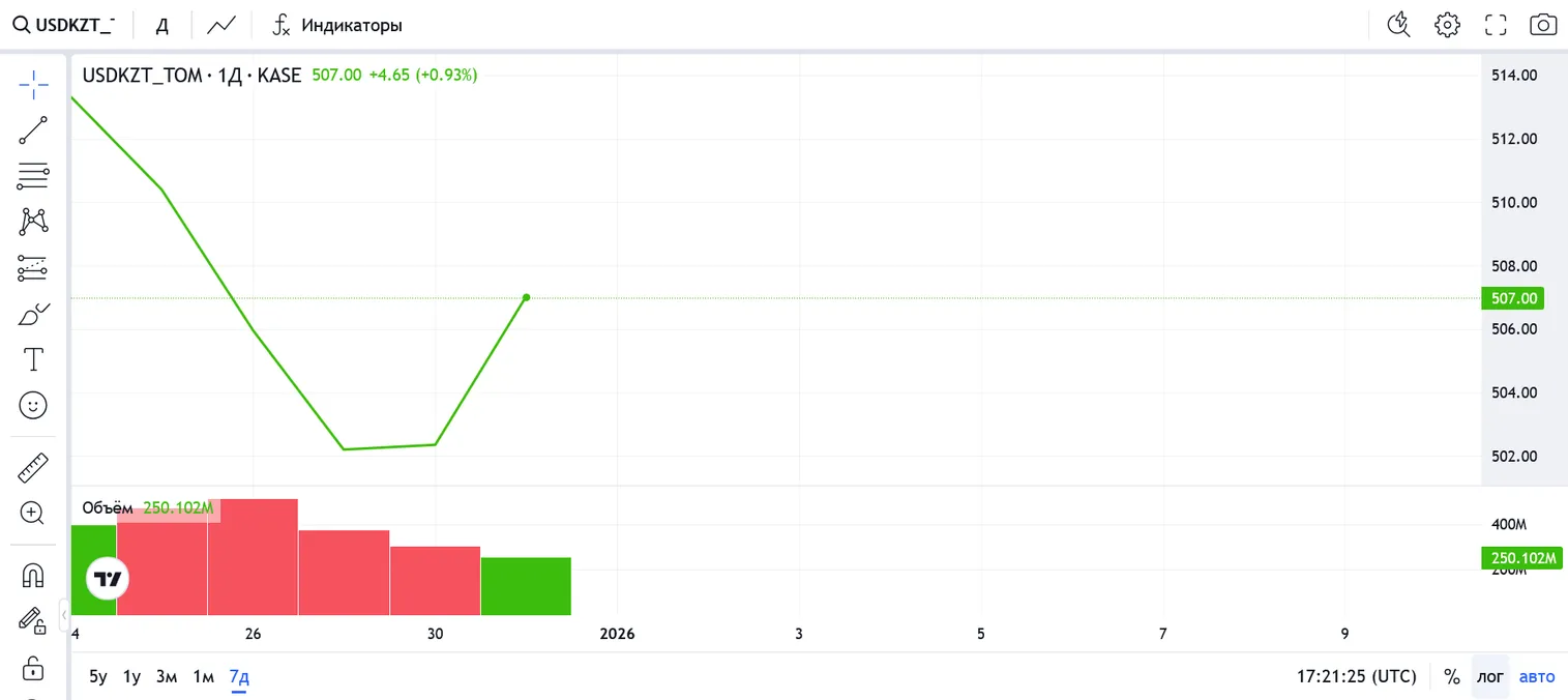 По информации KASE, на торгах минимальный курс сложился на уровне 502,50 тенге за доллар, максимальный – 508,35 тенге, курс закрытия – 507,00 тенге. Объем торгов по американской валюте составил 250 млн 102 тыс. долларов. Число сделок по операциям с валютой – 586. По данным kurs.kz, в обменных пунктах столицы максимальный курс продажи американской валюты на 17:15 составил 517 тенге, Алматы – 520 тенге.
