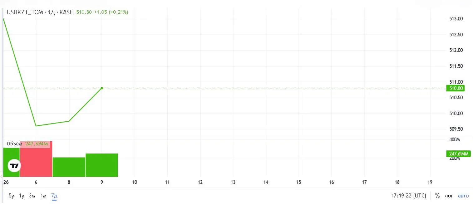 Средневзвешенный курс доллара на бирже составил 509,94 тенге