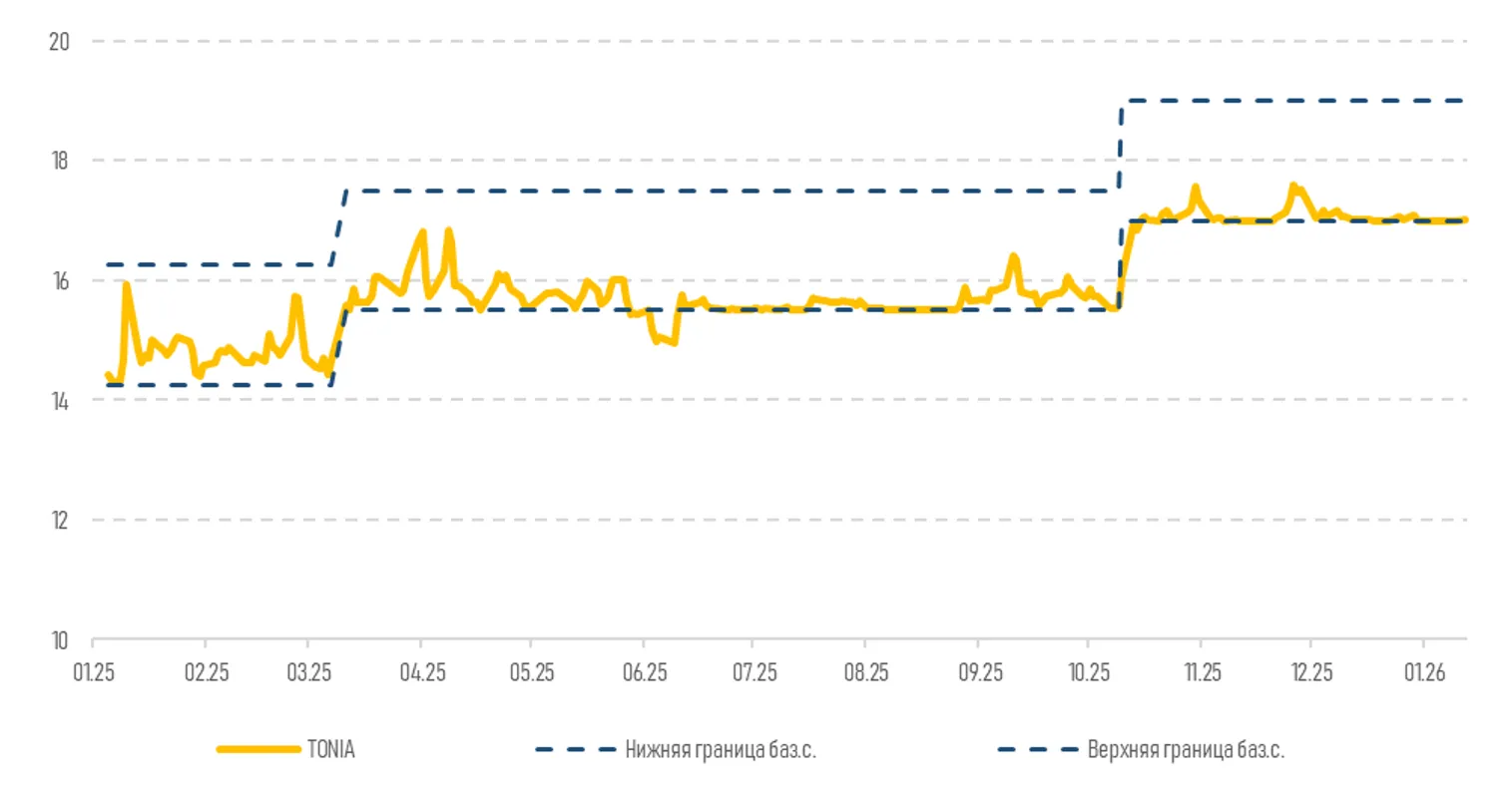 Диаграмма 2. Динамика коридора процентных ставок и ставки TONIA: