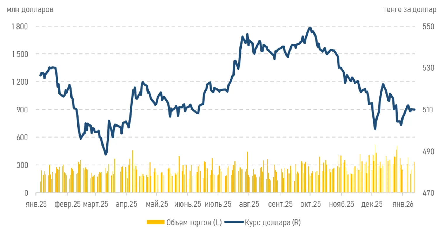 На торгах понедельника курс по валютной паре USD/KZT колебался в узком диапазоне, закрепившись на отметке 509,82 тенге за доллар (-0,26 тенге) при повышенном объеме торгов в 333,2 млн долларов (+85,5 млн долларов). Очевидно, что спрос на инвалюту со стороны субъектов экономики (оплата импорта и зарубежных услуг, обслуживание внешнего долга) полностью удовлетворялся за счет продажи инвалюты в рамках операций Национального банка, а также продажи валютной выручки субъектами КГС и экспортерами.