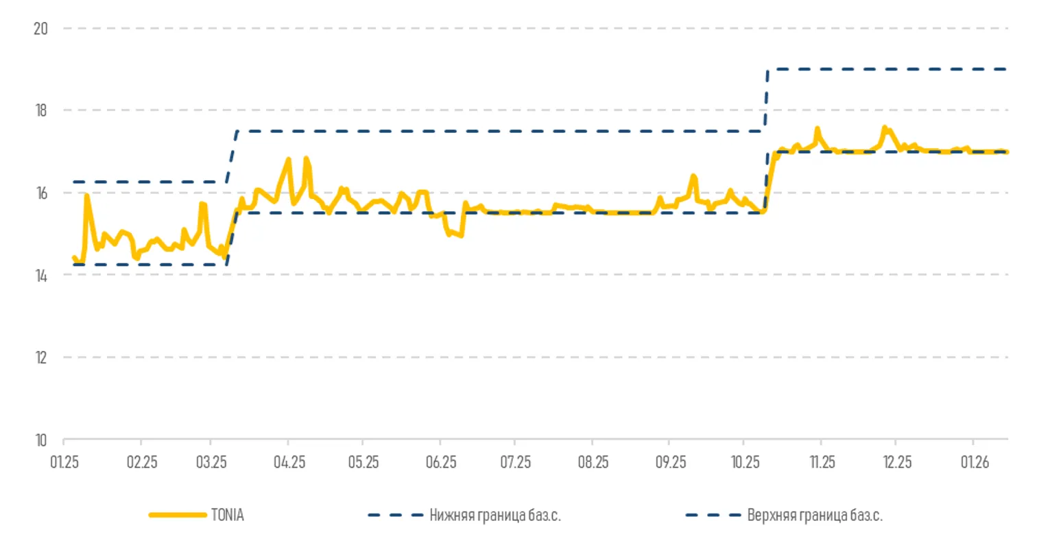 Диаграмма 2. Динамика коридора процентных ставок и ставки TONIA: