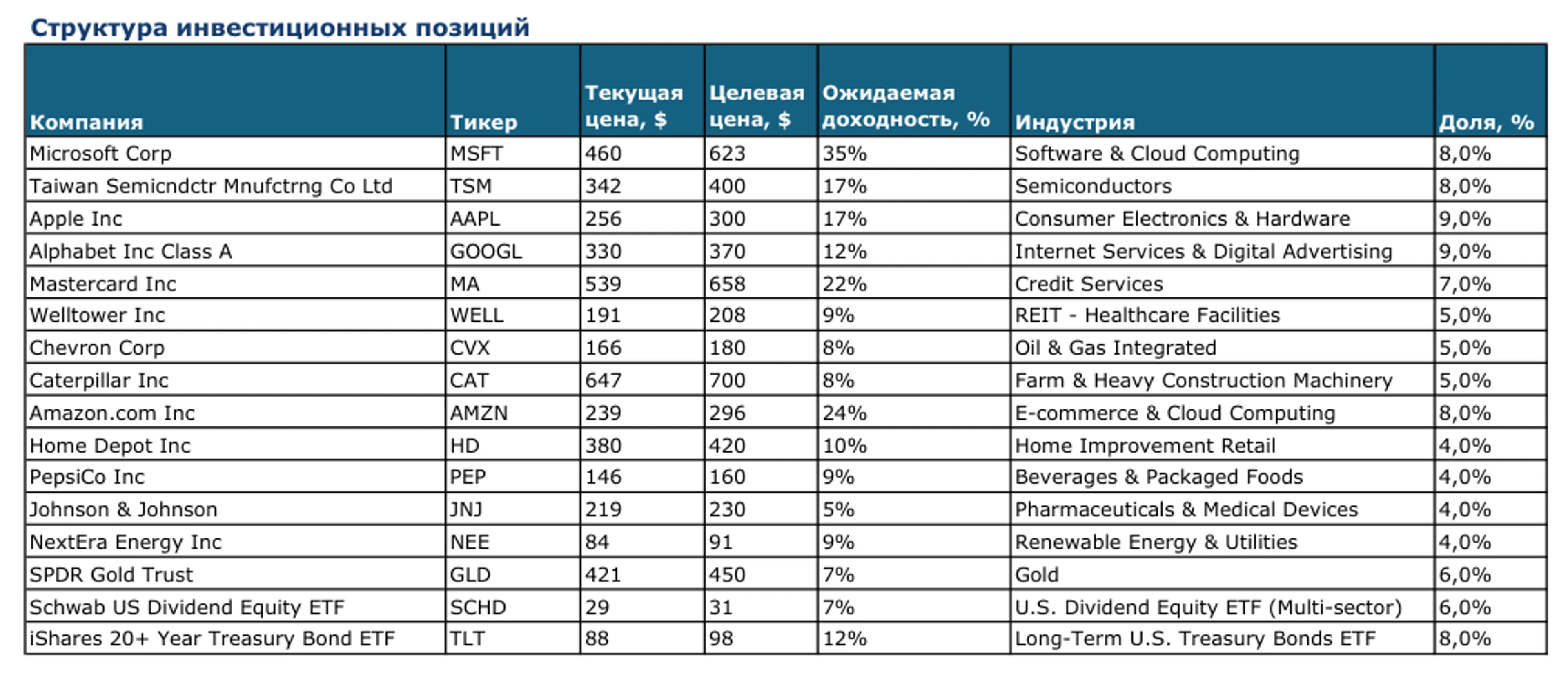 Microsoft Corporation – рост облачных решений и искусственного интеллекта, высокая рентабельность и предсказуемые корпоративные доходы. Потенциал роста – 35%, риски – замедление роста облака и увеличение капитальных затрат.