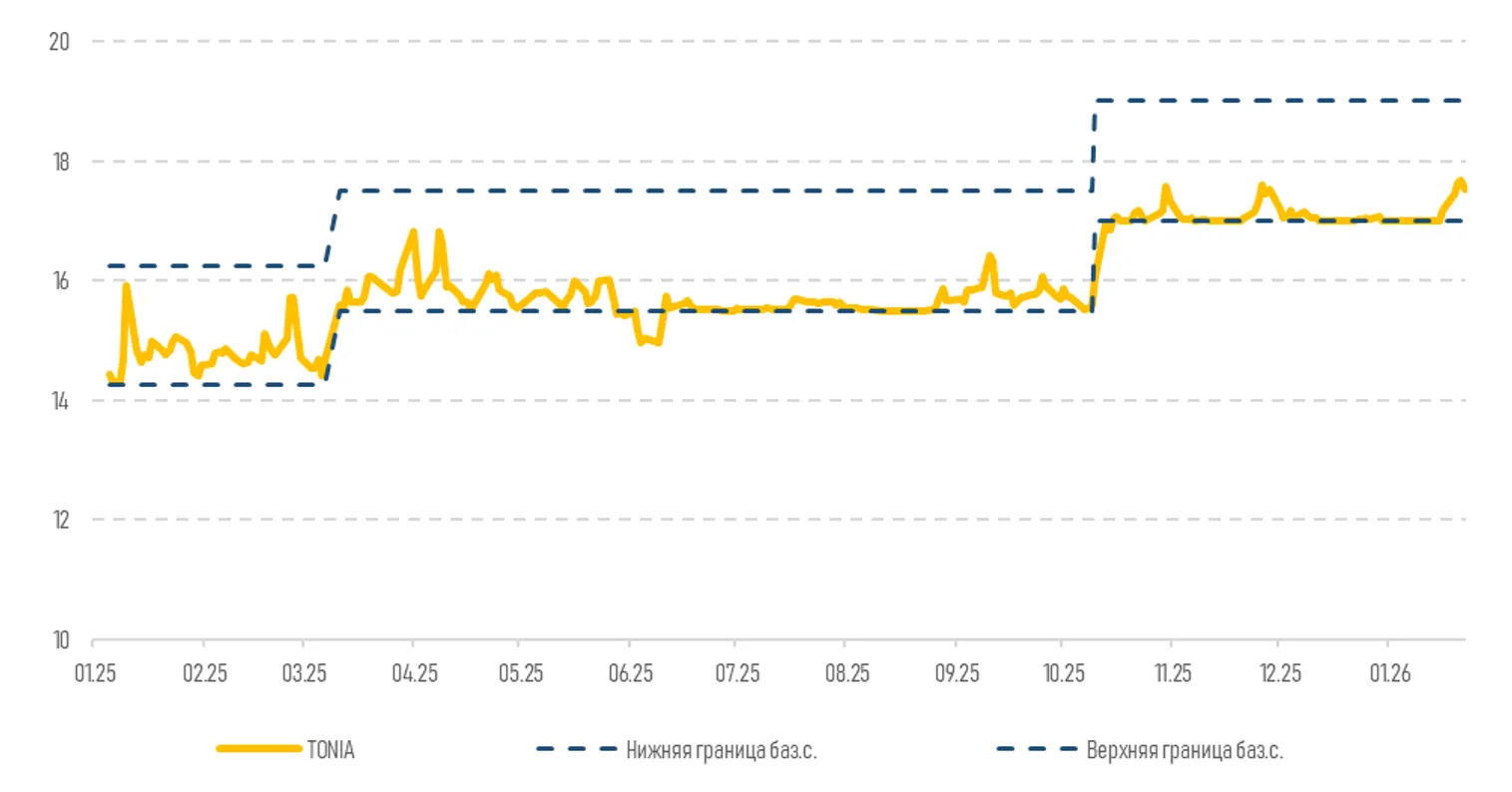 Диаграмма 2. Динамика коридора процентных ставок и ставки TONIA: