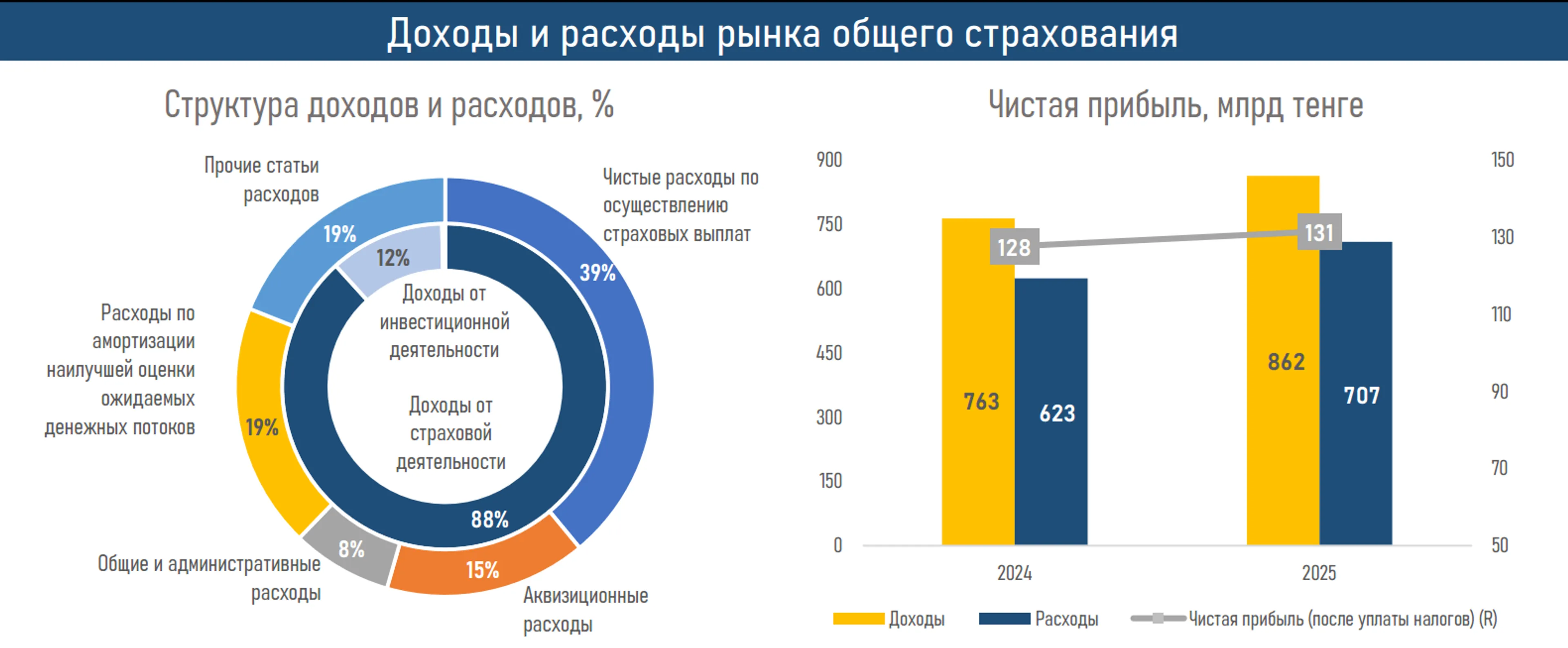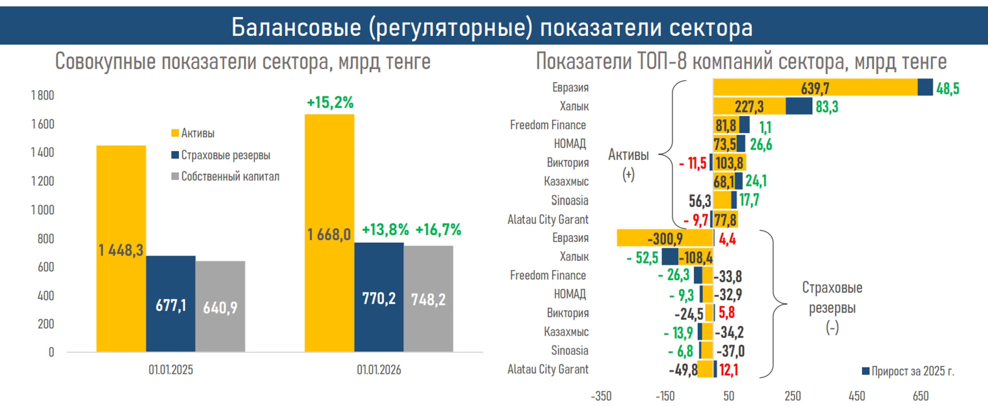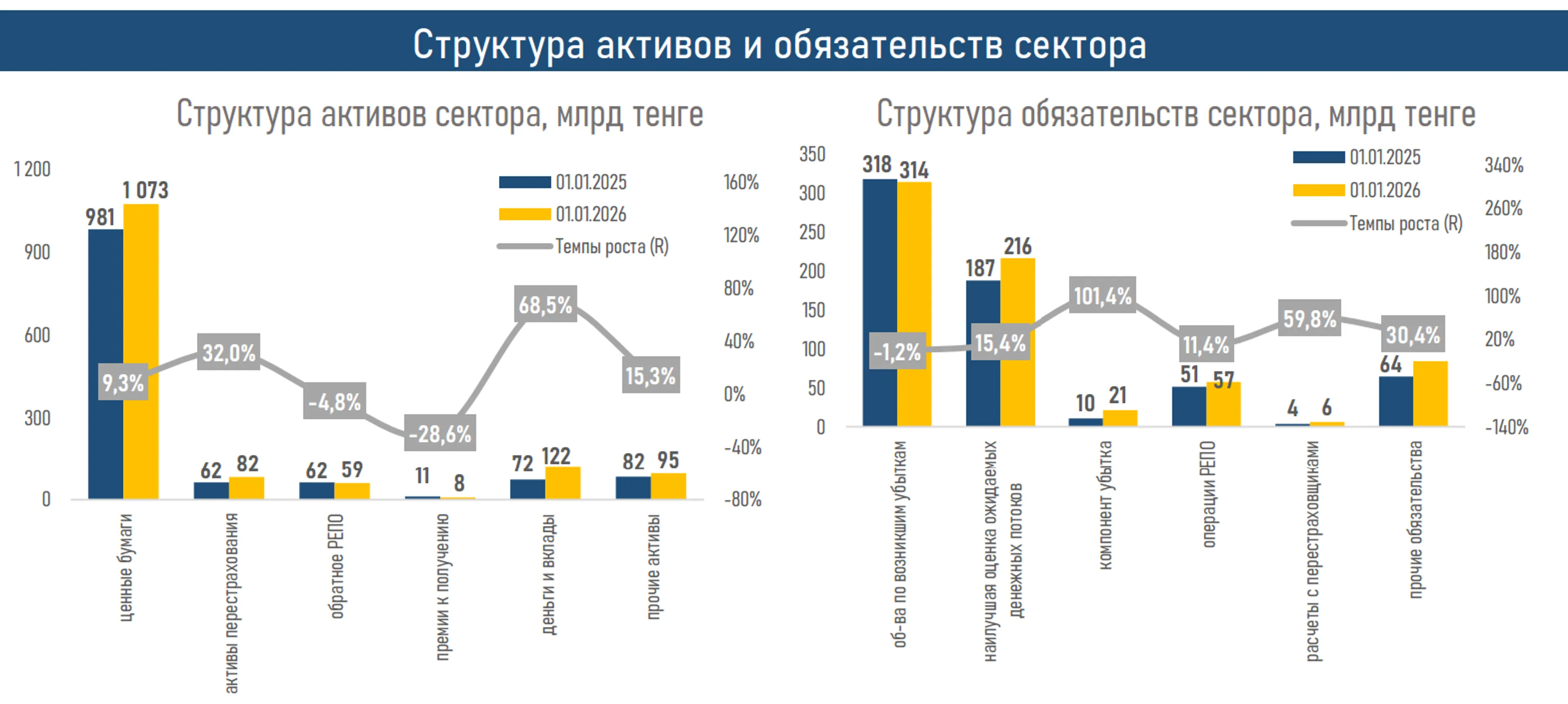 - По итогам 2025 года активы компаний общего страхования (КОС) выросли на 15,2% против более скромного увеличения на 5,2% годом ранее. Такая динамика была обеспечена прежде всего операционными факторами — ростом страховых премий (+160 млрд тенге) и существенным улучшением результата страховой деятельности (+154 млрд тенге).