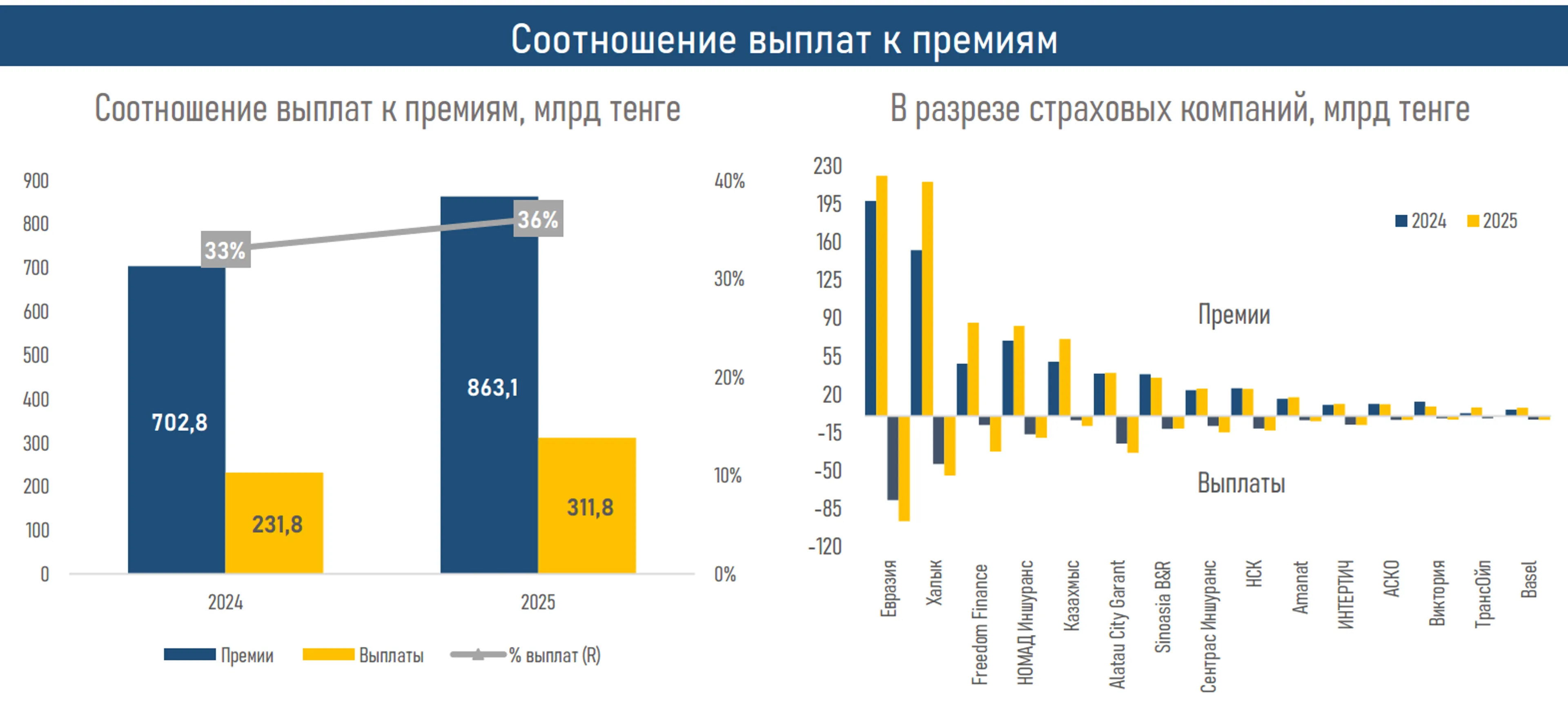 - Рост выплат отражает как увеличение страхового покрытия и числа заключенных договоров (+759 тыс.), так и удорожание застрахованных активов, что привело к росту среднего размера выплаты до 373 тыс. против 282 тыс. тенге ранее (+32%).