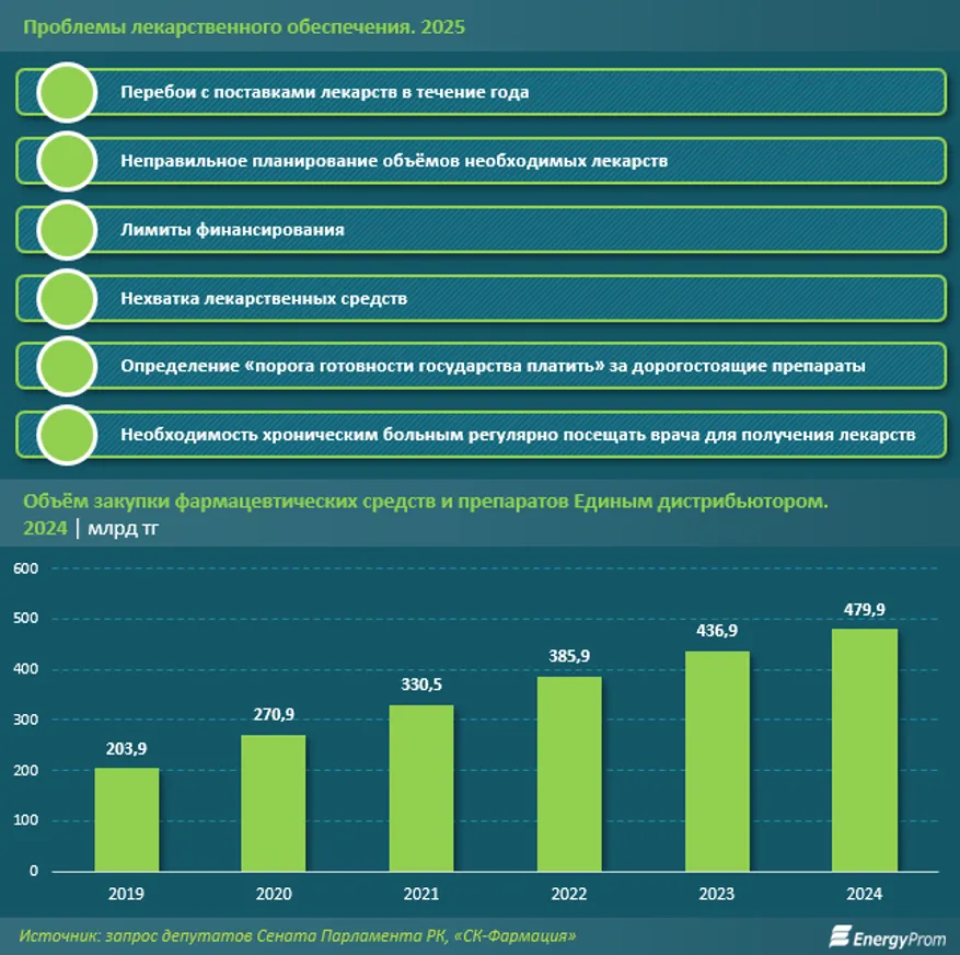 Между тем финансирование закупок Единым дистрибьютором фармацевтических средств и препаратов ежегодно растет. Например, в прошлом году сумма средств, направленных из бюджета и Фонда обязательного медицинского страхования (ФОМС), достигла рекордных за последние годы значений: 479,9 млрд тенге. Это на 9,8% больше, чем в 2023 году, и в 2,4 раза больше, чем пятью годами ранее.