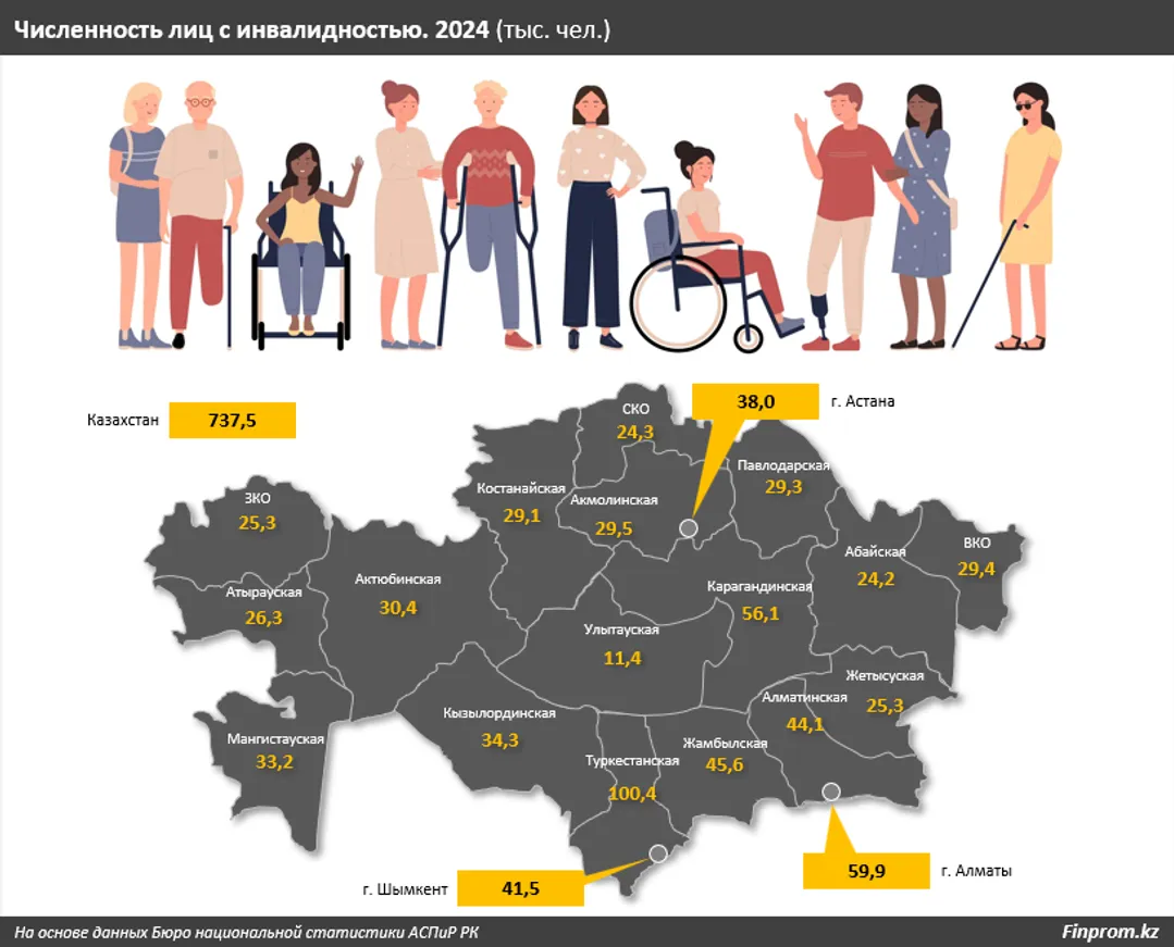 В 2024 году в Казахстане проживали 737,5 тыс. человек с инвалидностью — на 1,7% больше, чем годом ранее. В том числе численность детей с особыми потребностями увеличилась за год на 4,8%, составив 114,7 тыс. человек. Из года в год численность казахстанцев с инвалидностью продолжает расти, сообщает Finprom.kz.
