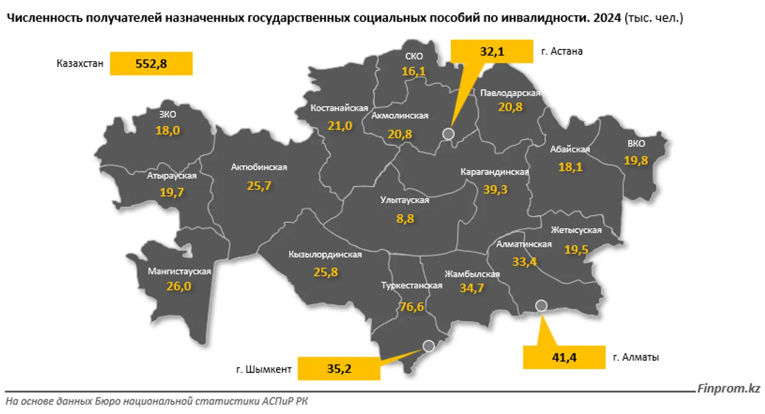В региональном разрезе больше всего людей с инвалидностью проживало в Туркестанской области: 100,4 тыс. человек, против 98,2 тыс. человек годом ранее. Далее следуют Алматы (59,9 тыс. человек), а также Карагандинская (56,1 тыс. человек), Жамбылская (45,6 тыс. человек) и Алматинская (44,1 тыс. человек) области. Меньше всего казахстанцев с инвалидностью проживало в Улытауской, Абайской и Северо-Казахстанской областях.
