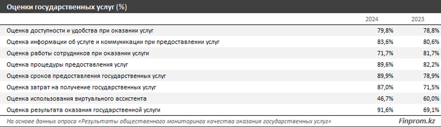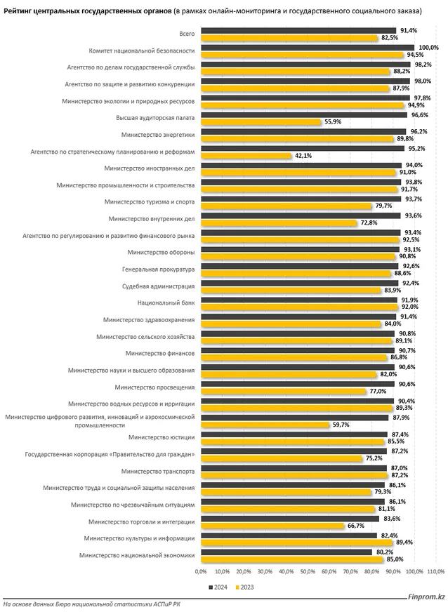 Важный момент: по итогам массового опроса услугополучателей по 70 государственным услугам, проведенного в рамках государственного социального заказа и онлайн-мониторинга, был составлен рейтинг уполномоченных центральных государственных органов за 2024 год. Общий уровень удовлетворенности составил 91,4%. Рейтинг сформирован на основе критериев, относящихся к зоне ответственности центральных государственных органов, без учета деятельности по предоставлению услуг через портал «электронного правительства» и НАО «Госкорпорация «Правительство для граждан».