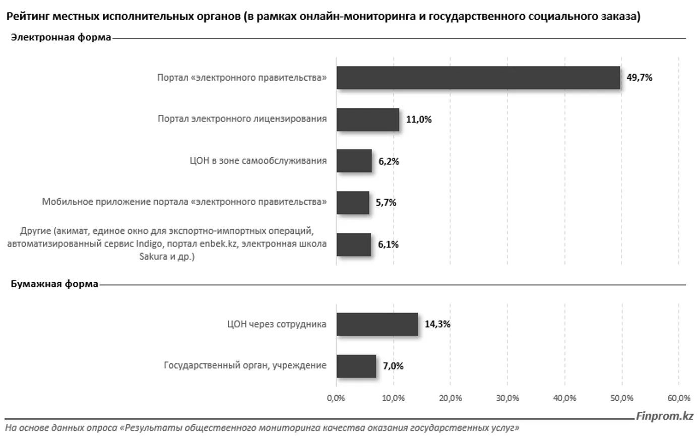 Наиболее востребованной формой получения государственных услуг в 2024 году стала электронная форма: 78,7%, против 50,7% годом ранее. На получение услуг в бумажной форме пришлось 21,3%. Среди электронных каналов чаще всего использовался портал «электронного правительства»: 49,7%. Далее следуют портал электронного лицензирования (11%), ЦОН в зоне самообслуживания (6,2%) и мобильное приложение портала «электронного правительства» (5,7%). В бумажной форме чаще всего услуги оказывались через сотрудника ЦОН: 14,3%. Ещё 7% услуг было предоставлено государственными органами и учреждениями.