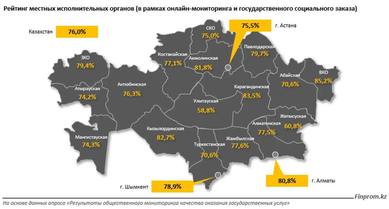 Что касается работы местных исполнительных органов, уровень удовлетворенности респондентов составил 76%, против 78,3% годом ранее. Рейтинг также составлен на основе критериев, относящихся к зоне их ответственности, без учета деятельности портала «электронного правительства» и НАО «Госкорпорация «Правительство для граждан». В рамках анализа были рассмотрены 15 услуг, предоставляемых местными исполнительными органами.